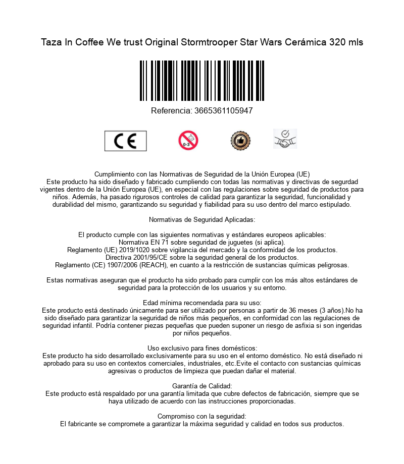 https://dvdstorespain.es/en/cinema-series-and-video-games-merchandising/102970-in-coffee-we-trust-original-stormtrooper-star-wars-ceramic-mug-320-mls-3665361105947.html102970Taza In Coffee We trust Original Stormtrooper Star Wars Cerámica 320 mlsThe officially licensed brand Original Stormtrooper brings us the most curious and fun items based on the most iconic stormtroopers in cinema, those from the Star Wars universe. This time we bring a high-quality ceramic mug with a 320 ml capacity. It has an illustration in which several stormtroopers raise their coffee cups before them accompanied by the phrase 'In Coffee We Trust'. Do you also trust coffee? It is dishwasher and microwave safe and comes in a window box. Feel like one of the real stormtroopers and get up every morning ready to defend your own empire.https://dvdstorespain.es/601011-home_default/in-coffee-we-trust-original-stormtrooper-star-wars-ceramic-mug-320-mls.jpg7.3554instockShepperton Design Studios7.35547.3554002023-02-09T01:28:22+0100/Start/Start/Cinema, Series and Video Games Merchandising/Start/New/Start/Cinema, Series and Video Games Merchandising/Cups