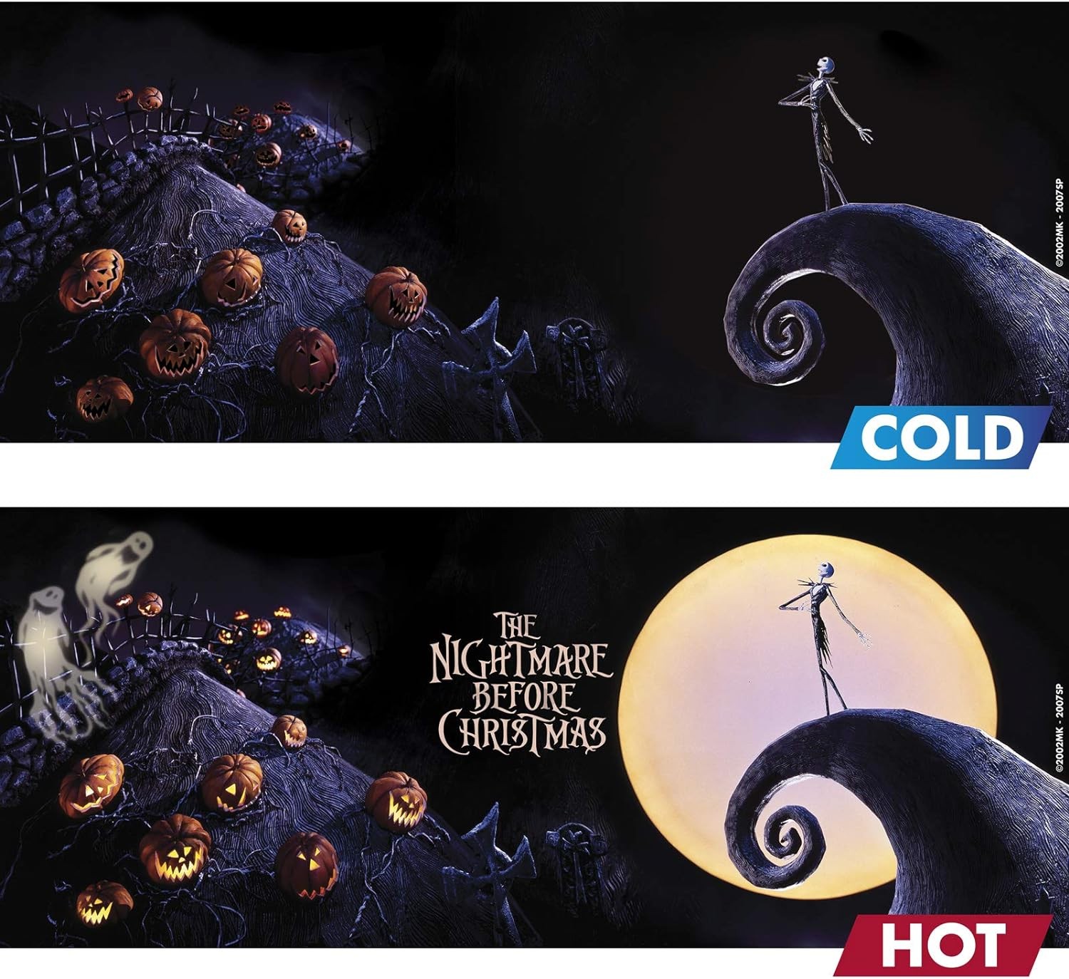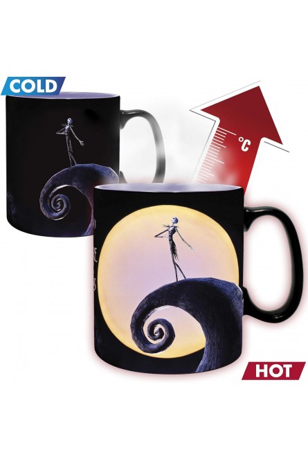 Jack Skellington tenía una relación muy especial con la luna en la película “Pesadilla Antes de Navidad”, producida por Disney y el visionario Tim Burton, y dirigida por el maestro cineasta del stop motion, Henry Sellick. La marca Abystyle quiere rendirle tributo a las mágicas escenas de la película en las que Jack se recortaba contra la silueta de la luna, y para ello ha cread esta exclusiva taza térmica que cambia de color cuando tiene líquido caliente. Está hecha de cerámica y tiene una capacidad de 460 mls. Vierte tu bebida caliente favorita, y verás como una enorme luna llena aparece detrás de Jack. No es apta para lavavajillas ni microondas, pero si para beber lo que quieras mientras miras la luna con aire distraído.
