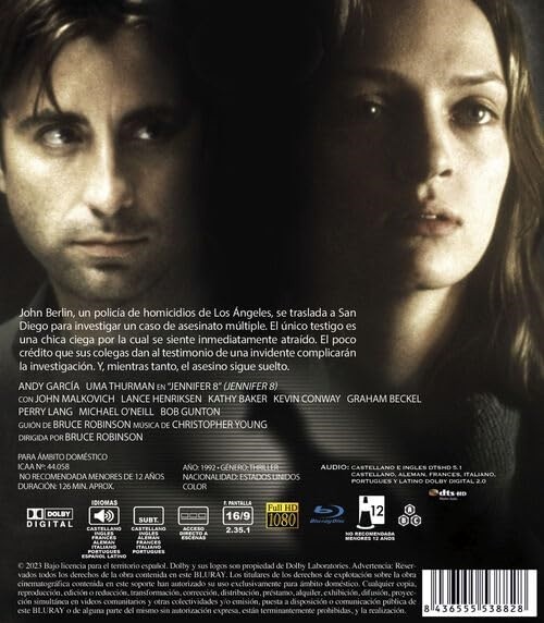 https://dvdstorespain.es/en/films/104693-jennifer-8-bluray--8436555538828.html104693Jennifer 8 [Blu-ray] (1992)John Berlin, un policía de homicidios de Los Ángeles, se traslada a San Diego para investigar un caso de asesinato múltiple. El único testigo es una chica ciega por la cual se siente inmediatamente atraído. El poco crédito que sus colegas dan al testimonio de una invidente complicarán la investigación. Y, mientras tanto, el asesino sigue suelto.https://dvdstorespain.es/605915-home_default/jennifer-8-bluray-.jpg5.1456instockResearch8.5765.1456403.43042023-03-14T02:00:24+0100/Start/Start/Blu-Ray/Start/Films/Start/New/Start/EVENING SP 20/Start/VELADA DE 40/Start/VELADA FR 40/Start/VELADA IT 40/Start/ HALLOWEEN SALES/Start/ HALLOWEEN SALES/-40%