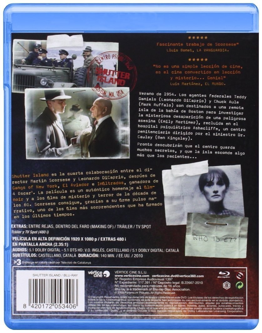 https://dvdstorespain.es/en/films/108547-shutter-island-blu-ray--8420172053406.html108547Shutter Island [Blu-ray]<div id="productDescription" class="a-section a-spacing-small"> <!-- show up to 2 reviews by default --><br /><p> <span>Verano de 1954. Los agentes judiciales Teddy Daniels (Leonardo DiCaprio) y Chuck Aule (Mark Ruffalo) son destinados a una remota isla del puerto de Boston para investigar la desaparición de una peligrosa asesina (Emily Mortimer) recluida en el hospital psiquiátrico Ashecliffe, un centro penitenciario para criminales perturbados dirigido por el siniestro doctor John Cawley (Ben Kingsley). Pronto descubrirán que el centro guarda muchos secretos, y que la isla esconde algo más peligroso que los pacientes... Thriller psicológico basado en la novela homónima de Dennis Lehane (autor de "Mystic River" y "Gone Baby Gone").</span> </p> </div>https://dvdstorespain.es/769742-home_default/shutter-island-blu-ray-.jpg8.9256instock8.92568.9256002023-05-26T01:35:52+0200/Start/Start/Blu-Ray/Start/Films/Start/New