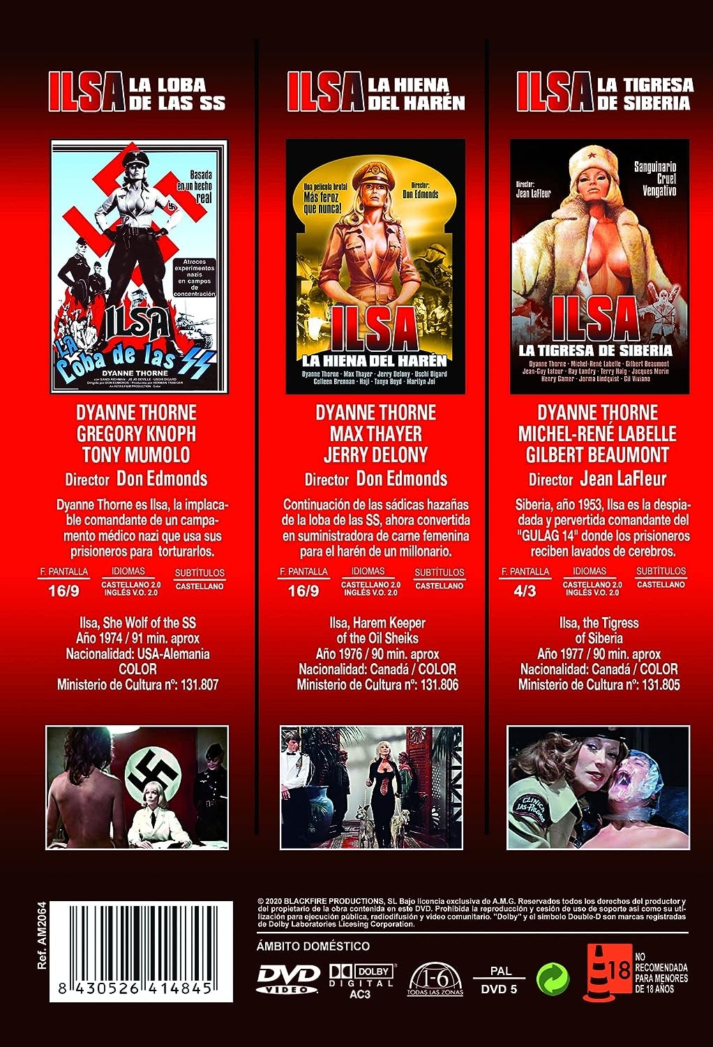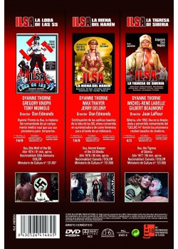 Ilsa, The Wolf of the SS: Dyanne Thorne is Ilsa, the ruthless commander of a Nazi medical camp who uses her prisoners (often naked women) for the most painful and brutal torture she can think of in the name of war. , and to demonstrate his sexual supremacy. He also uses male recruits to sleep with and castrate them the next day. Ilsa, The Hyena of the Harem: Continuation of the sadistic exploits of the SS wolf, now converted into a supplier of female meat for the harem of a millionaire oil caid. Ilsa, The Tigress of Siberia: Siberia, year 1953, during Stalin's dictatorship. Ilsa is the ruthless and perverted commander of "GULAG 14" where prisoners are brainwashed and re-educated in favor of Stalin's ideas. When Stalin's dictatorship suddenly ends, Ilsa and her collaborators are forced to flee to Canada. More than 20 years later, during the Montreal 76' Olympic Games, Ilsa meets a former prisoner of GULAG 14, who was one of her toughest opponents. Now Ilsa runs a chain of luxurious hotels and will use her power to take revenge on her old enemy.