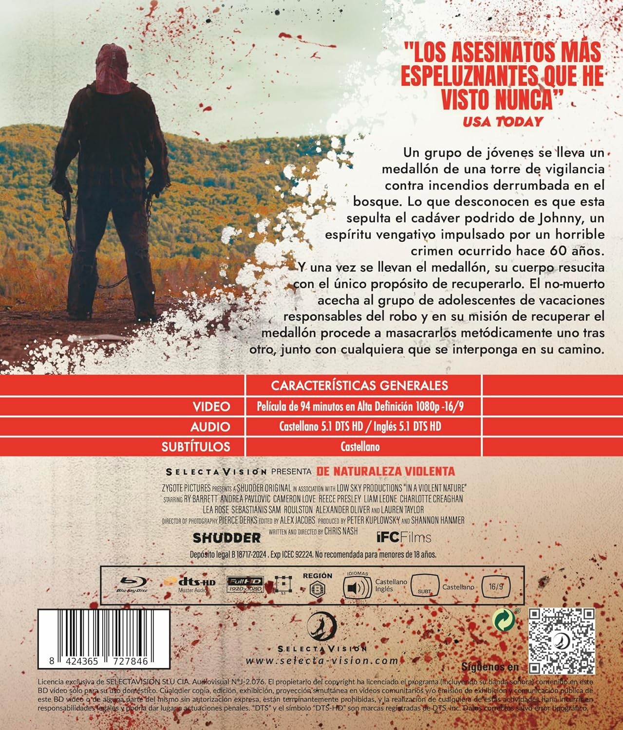 https://dvdstorespain.es/en/films/120008-de-naturaleza-violenta-bluray-pelicula-blu-ray--8424365727846.html120008De Naturaleza Violenta [Blu-ray] (2024) In a Violent NatureUn grupo de jóvenes se lleva un medallón de una torre de vigilancia contra incendios derrumbada en el bosque. Lo que desconocen es que esta sepulta el cadáver podrido de Johnny, un espíritu vengativo impulsado por un horrible crimen ocurrido hace 60 años. Y una vez se llevan el medallón, su cuerpo resucita con el único propósito de recuperarlo. El no-muerto acecha al grupo de adolescentes de vacaciones responsables del robo y en su misión de recuperar el medallón procede a masacrarlos metódicamente uno tras otro, junto con cualquiera que se interponga en su camino.https://dvdstorespain.es/673805-home_default/de-naturaleza-violenta-bluray-pelicula-blu-ray-.jpg13.2231instockSELECTA VISION13.223113.2231002024-12-26T22:33:04+0100/Start/Start/Blu-Ray/Start/Films/Start/New