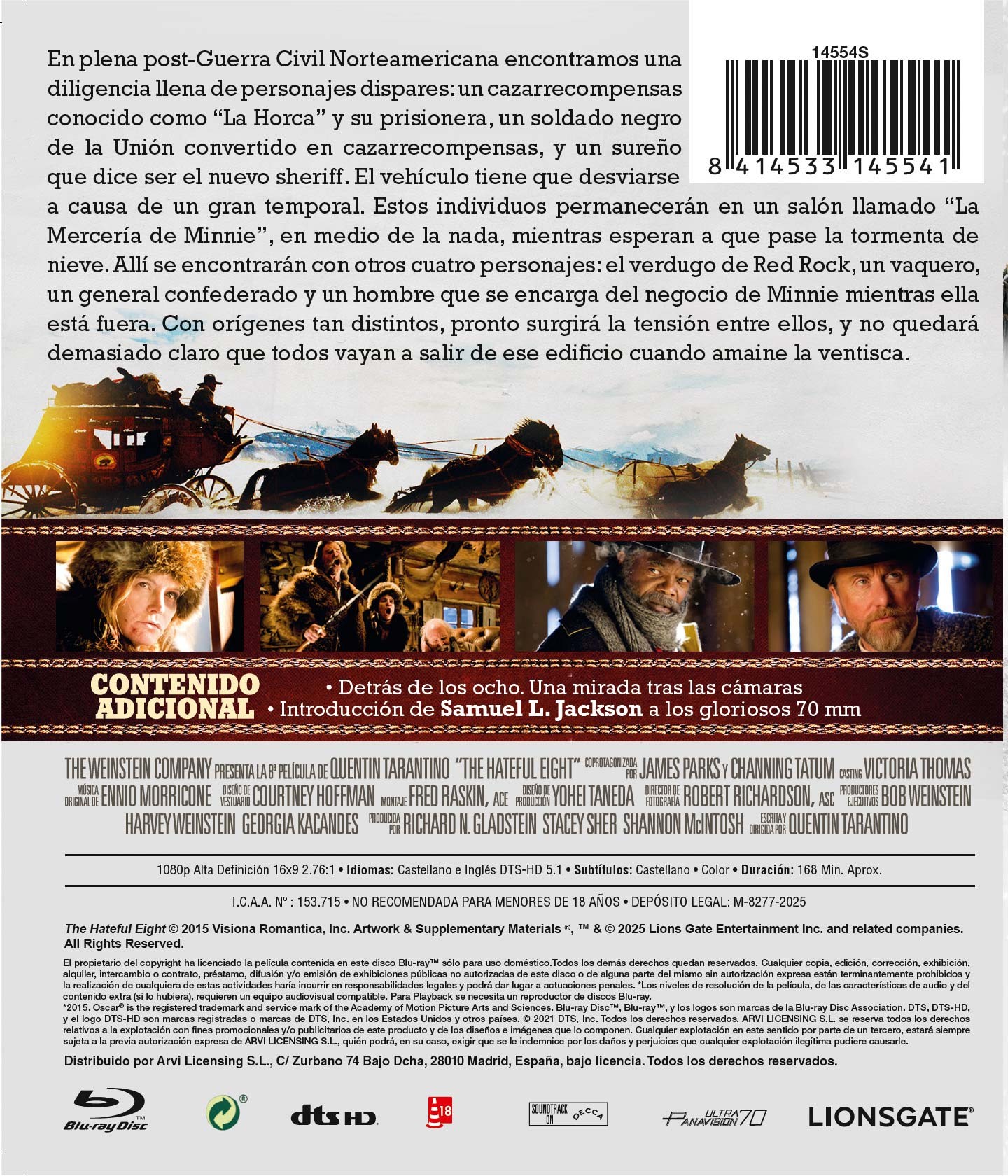 https://dvdstorespain.es/en/films/124299-los-odiosos-ocho-blu-ray-2015-the-hateful-eight-8414533145541.html124299Los Odiosos Ocho [Blu-ray] (2015) The Hateful EightPocos años después de la Guerra de Secesión, una diligencia avanza por el invernal paisaje de Wyoming. Los pasajeros, el cazarrecompensas John Ruth (Kurt Russell) y su fugitiva Daisy Domergue (Jennifer Jason Leigh), intentan llegar al pueblo de Red Rock, donde Ruth entregará a Domergue a la justicia. Por el camino, se encuentran con dos desconocidos: el mayor Marquis Warren (Samuel L. Jackson), un antiguo soldado de la Unión convertido en cazarrecompensas de mala reputación, y Chris Mannix (Walton Goggins), un renegado sureño que afirma ser el nuevo sheriff del pueblo. Como se aproxima una ventisca, los cuatro se refugian en la Mercería de Minnie, una parada para diligencias de un puerto de montaña. Cuando llegan al local se topan con cuatro rostros desconocidos: el mexicano Bob (Demian Bichir), Oswaldo Mobray (Tim Roth), verdugo de Red Rock, el vaquero Joe Gage (Michael Madsen) y el general confederado Sanford Smithers (Bruce Dern). Mientras la tormenta cae sobre la parada de montaña, los ocho viajeros descubren que tal vez no lleguen hasta Red Rock después de todo.https://dvdstorespain.es/906837-home_default/los-odiosos-ocho-blu-ray-2015-the-hateful-eight.jpg11.7355instock11.735511.7355002025-07-09T09:45:48+0200/Start/Start/Blu-Ray/Start/Films/Start/New