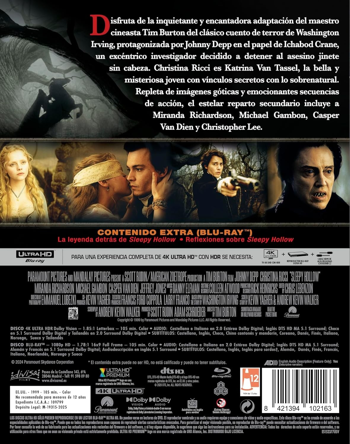 https://dvdstorespain.es/en/films/126701-sleepy-hollow-1999-tim-burton-4k-uhd-blu-ray-blu-ray--8421394102163.html126701Sleepy Hollow [4K UHD, Blu-ray] (1999)Norteamérica, finales del siglo XVIII. El condestable Ichabod Crane (Depp), un investigador de Nueva York que utiliza avanzados métodos de averiguación, es enviado al pequeño y remoto pueblo de Sleepy Hollow para descubrir qué hay de verdad en la leyenda de un jinete sin cabeza que aterroriza a su habitantes.https://dvdstorespain.es/1078394-home_default/sleepy-hollow-1999-tim-burton-4k-uhd-blu-ray-blu-ray-.jpg21.4876instockDivisa HV - Paramount21.487621.4876002025-09-11T15:17:12+0200/Start/Start/Films/Start/New/Start/4K-UHD