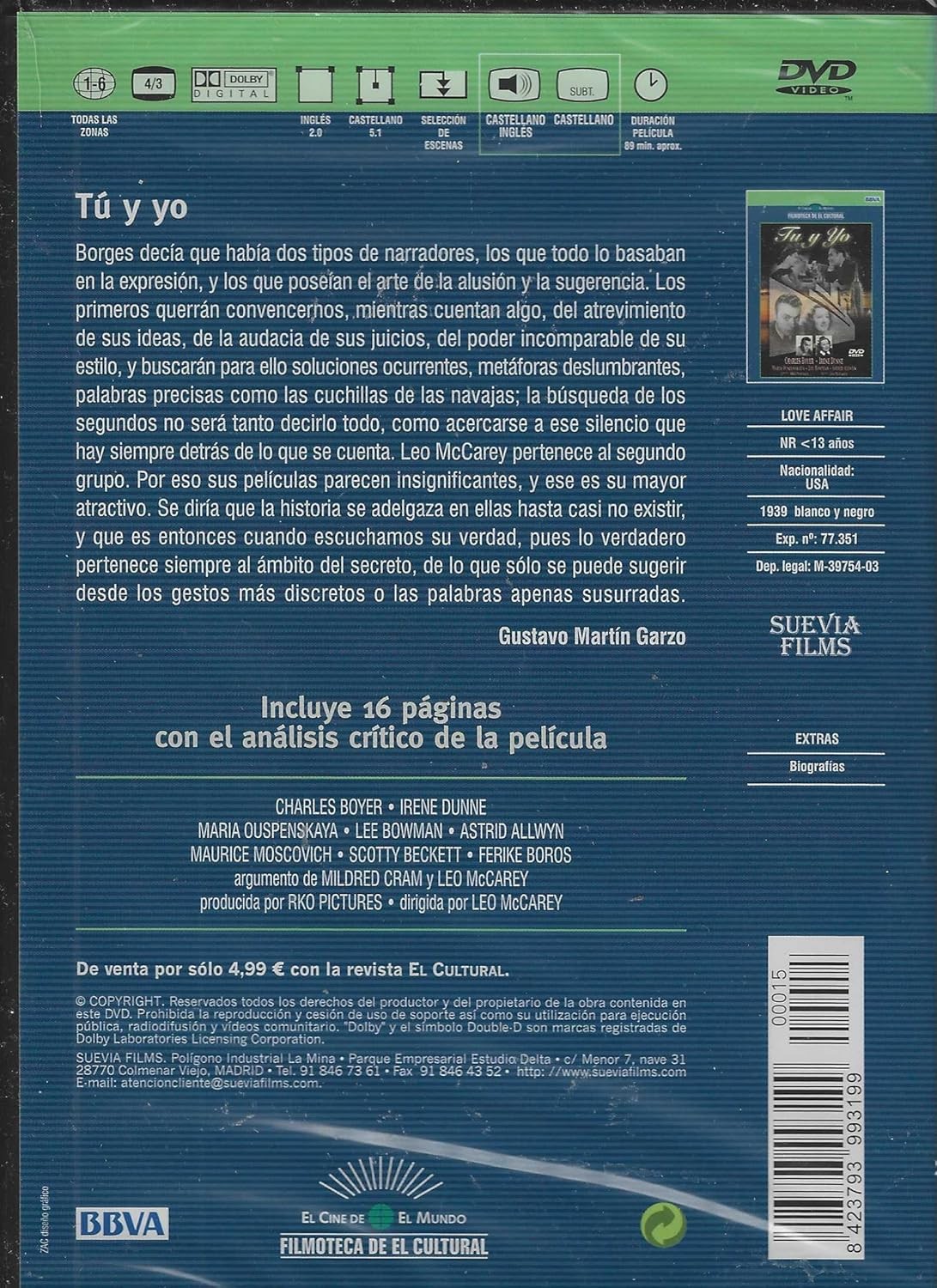 https://dvdstorespain.es/en/films/127366-tu-y-yo-dvd-edicion-filmoteca-de-el-cultural-bbva-dvd-2024--0634065160821.html127366Tú Y Yo (Filmoteca de El Cultural BBVA) [DVD] (1939) Love AffairUn elegante play boy y una bella cantante de un club nocturno se conocen a bordo de un transatlántico, gracias a la invitación de otras dos personas. Ella es la amante de un magnate y él está comprometido con una rica heredera. Entre ellos surge un apasionante romance que los llevará a la siguiente promesa: romper con sus compromisos actuales, buscar trabajo y encontrarse a los seis meses, para continuar su vida juntos. Pero un trágico accidente impide a Terry acudir a la cita, con lo que el futuro de ambos sufrirá un giro emotivo e incierto. https://dvdstorespain.es/1091492-home_default/tu-y-yo-dvd-edicion-filmoteca-de-el-cultural-bbva-dvd-2024-.jpg4.6281instockResearch4.62814.6281002025-10-21T04:46:20+0200/Start/Start/DVD/Start/Films/Start/New
