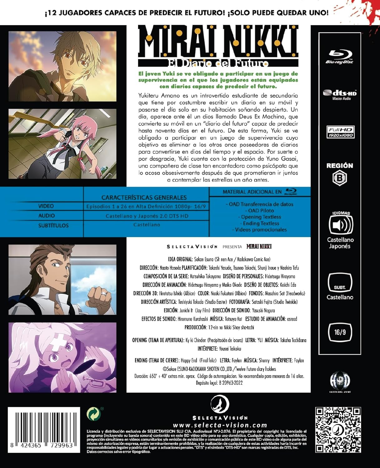 https://dvdstorespain.es/en/films/127673-mirai-nikki-serie-completa-2025-blu-ray-blu-ray-2025--8424365729963.html127673Mirai Nikki (Serie completa, edición 2025, 3 discos) [Blu-ray] (2011)Serie de TV (2011-2012). 26 episodios. Amano Yukiteru, un estudiante de 2º año de secundaria, es un chico solitario e introvertido que gasta todo su tiempo escribiendo un diario en su teléfono. Su único amigo es un producto de su imaginación, Deus Ex Machina, el Dios del Tiempo y el Espacio. Un día, este Dios le da al diario de Yukiteru la habilidad de ver lo que sucederá en los siguientes 90 días en el futuro y enrola a Yukiteru en un torneo mortal donde deberá luchar por su vida contra los poseedores de otros diarios similares. https://dvdstorespain.es/1096966-home_default/mirai-nikki-serie-completa-2025-blu-ray-blu-ray-2025-.jpg20.5785instockSELECTA VISION20.578520.5785002025-11-04T01:45:03+0100/Start/Start/Blu-Ray/Start/Films/Start/New