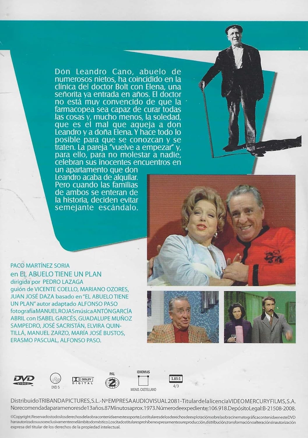 https://dvdstorespain.es/en/films/128488-el-abuelo-tiene-un-plan-dvd-edicion-sobre-dvd-2024--0634065164959.html128488El Abuelo Tiene un Plan (Edición Sobre) [DVD] (1973)Leandro, un viudo de sesenta y cinco años, vive alternativamente en casa de su hija y de su hijo, ambos casados. Dadas sus circunstancias, tiende a creer que padece todo tipo de enfermedades, por lo que ingresa en un sanatorio. Elena, una solterona llena de manías que vive con una hermana y una sobrina, es también una hipocondríaca que acaba en el hospital. Cuando ambos se conocen, se sienten atraídos y empiezan a verse a escondidas, pero cuando la familia se entera, ve el idilio como un escándalo. https://dvdstorespain.es/1113449-home_default/el-abuelo-tiene-un-plan-dvd-edicion-sobre-dvd-2024-.jpg4.9587instock4.95874.9587002025-12-23T22:45:36+0100/Start/Start/DVD/Start/Films/Start/New