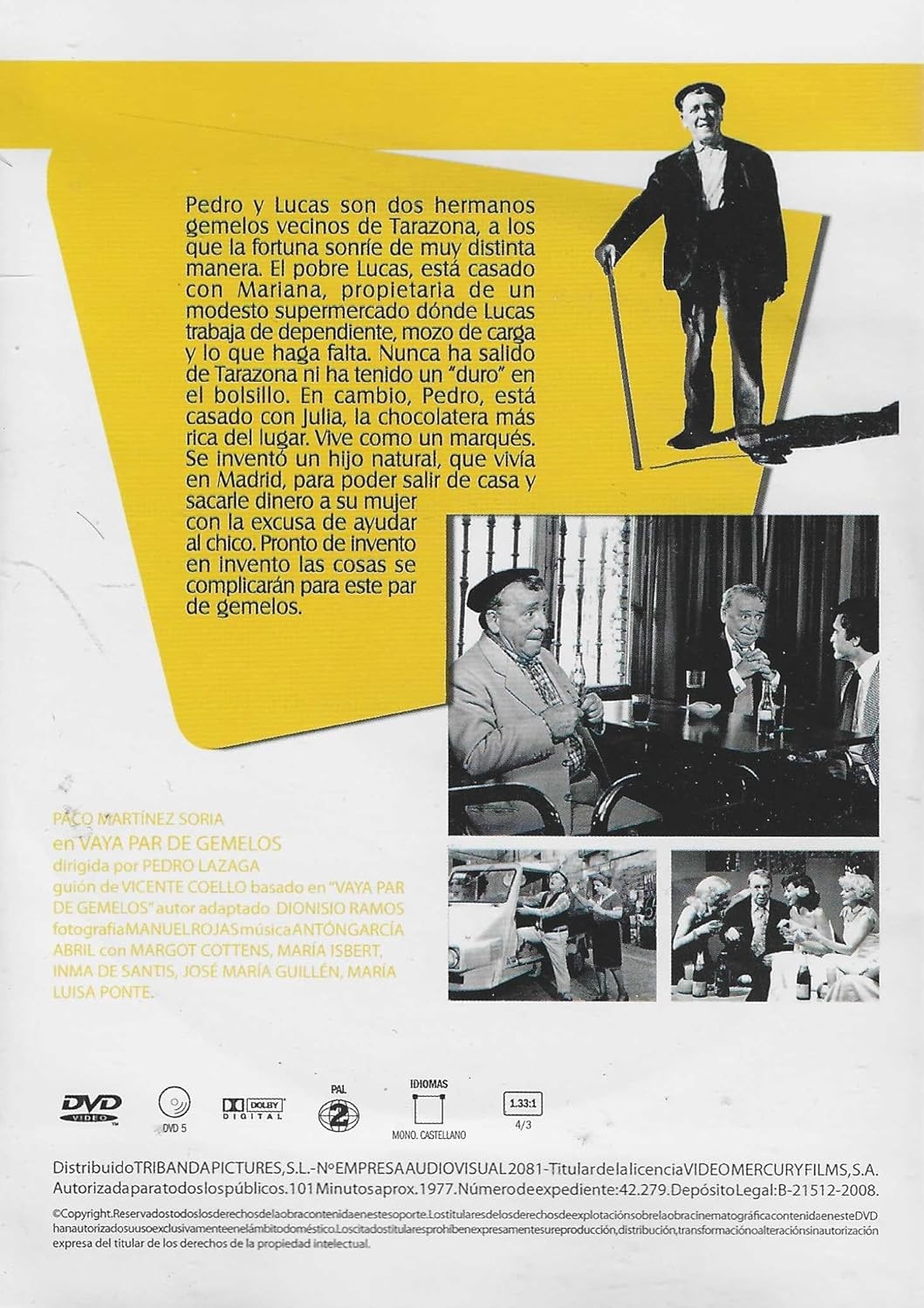https://dvdstorespain.es/en/films/128514-vaya-par-de-gemelos-dvd-edicion-sobre-dvd-2024--0634065164997.html128514¡Vaya Par de Gemelos! (Edición Sobre) [DVD] (1978)Pedro y Lucas (ambos Paco Martínez Soria) son dos hermanos que han seguido caminos muy distintos. Lucas está casado con Mariana, la propietaria de una pequeña tienda de comestibles, en la él que trabaja como mozo de carga. Pedro, aunque su mujer es muy tacaña, vive como un duque porque se ha inventado un hijo natural que vive en Madrid. Con el pretexto de mantenerlo, consigue de su mujer todo el dinero que quiere. https://dvdstorespain.es/1113869-home_default/vaya-par-de-gemelos-dvd-edicion-sobre-dvd-2024-.jpg4.9587instock4.95874.9587002025-12-24T08:45:09+0100/Start/Start/DVD/Start/Films/Start/New
