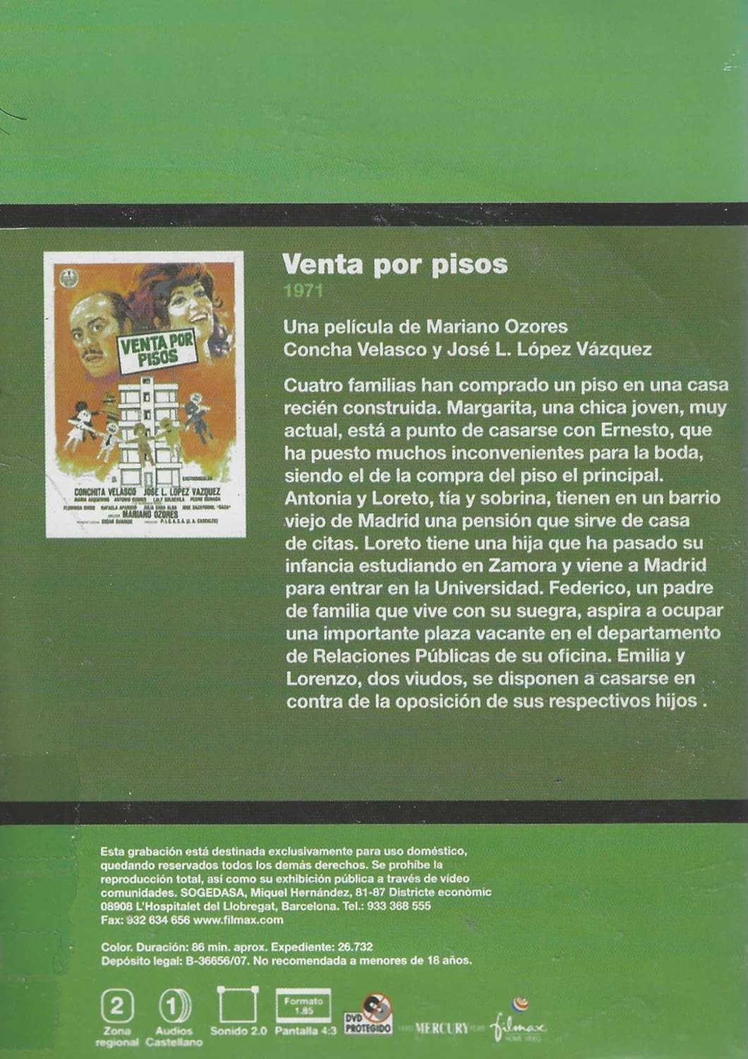 https://dvdstorespain.es/en/films/128539-venta-por-pisos-dvd-edicion-sobre-dvd-2024--0634065165222.html128539Venta por Pisos (Edición Sobre) [DVD] (1972)Cuatro familias están pensando en comprar un piso en un edificio recién construido. Margarita (Concha Velasco), una mujer joven y actual que desea casarse con Ernesto (Pedro Osinaga), que pone muchos inconvenientes para la boda, siendo el principal el tipo de vida de pintora artística de su novia. Doña Antonia (Rafaela Aparicio) y Doña Loreto (Florinda Chico), tía y sobrina, que regentan una pensión que sirve de casa de citas, y ahora se quieren mudar para ocultar su dudoso modo de vida ante la llegada de la aplicada hija de Doña Loreto para estudiar en la universidad. El matrimonio de Ana (Laly Soldevila) y Federico (Antonio Ozores), un padre de familia que vive con su suegra y aspira a una vida mejor con un ascenso en su oficina. Y la pareja madura de Emilia (Maruja Asquerino) y Lorenzo (José Luis López Vázquez), una pareja de viudos enamorados que están dispuestos a una nueva vida juntos a pesar de la oposición de sus respectivos hijos mayores.https://dvdstorespain.es/1114152-home_default/venta-por-pisos-dvd-edicion-sobre-dvd-2024-.jpg4.9587instock4.95874.9587002025-12-26T00:47:05+0100/Start/Start/DVD/Start/Films/Start/New