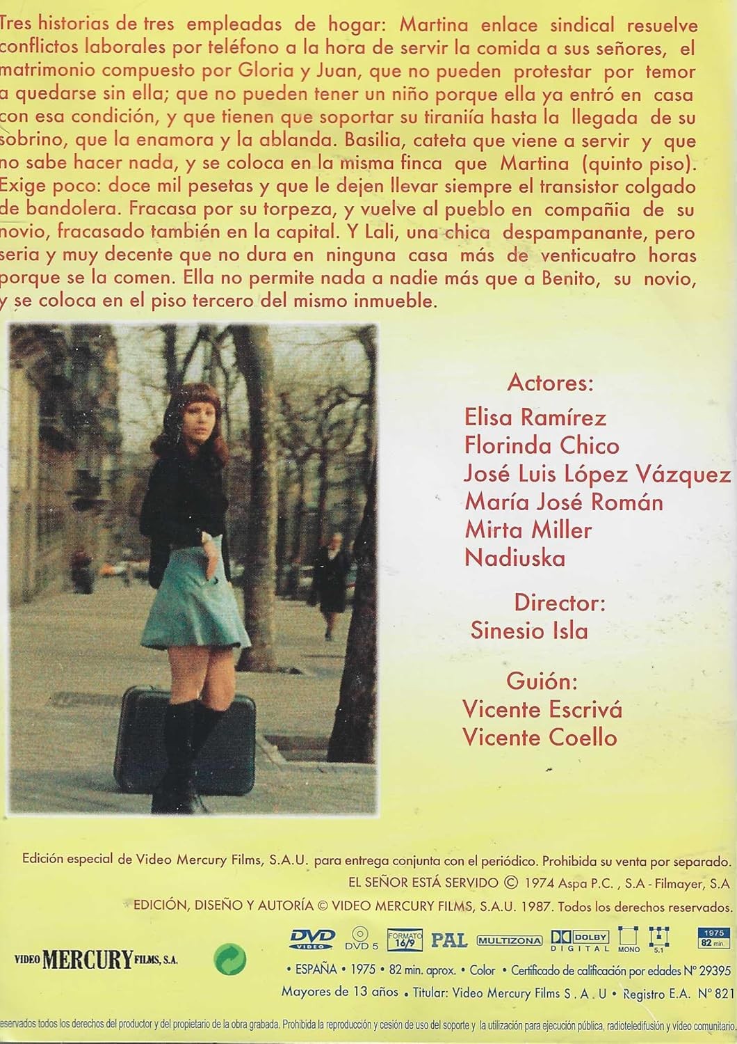https://dvdstorespain.es/en/films/128546-el-senor-esta-servido-dvd-edicion-sobre-dvd-2024--0634065165307.html128546El Señor Está Servido (Edición Sobre) [DVD] (1975)Tres historias de tres jóvenes empleadas del hogar: Martina (Elisa Ramírez), enlace sindical del sector que resuelve siempre las consultas laborales por teléfono a la hora de servir la comida a sus señores, el matrimonio compuesto por Gloria (Mirta Miller) y Juan (Rafael Alonso), que no pueden protestar por temor a quedarse sin ella. Basilia (Josele Román), una chica un tanto torpe y que no sabe hacer nada del hogar, que viene del pueblo a servir en la capital y que se coloca en el mismo bloque que Martina. Y Laly (Nadiuska), una chica despampanante, seria y muy decente, que no dura en ninguna casa más de veinticuatro horas porque todos los señores quieren manosearla. Y ella no le permite nada a nadie más que a Benito, su novio (Manolo Zarzo), y que al final también se instala en un piso del mismo inmueble: el de la familia del aparentemente serio y respetable señor Don Alberto Arregui (José Luis López Vázquez).https://dvdstorespain.es/1114490-home_default/el-senor-esta-servido-dvd-edicion-sobre-dvd-2024-.jpg4.9587instock4.95874.9587002025-12-26T10:45:17+0100/Start/Start/DVD/Start/Films/Start/New