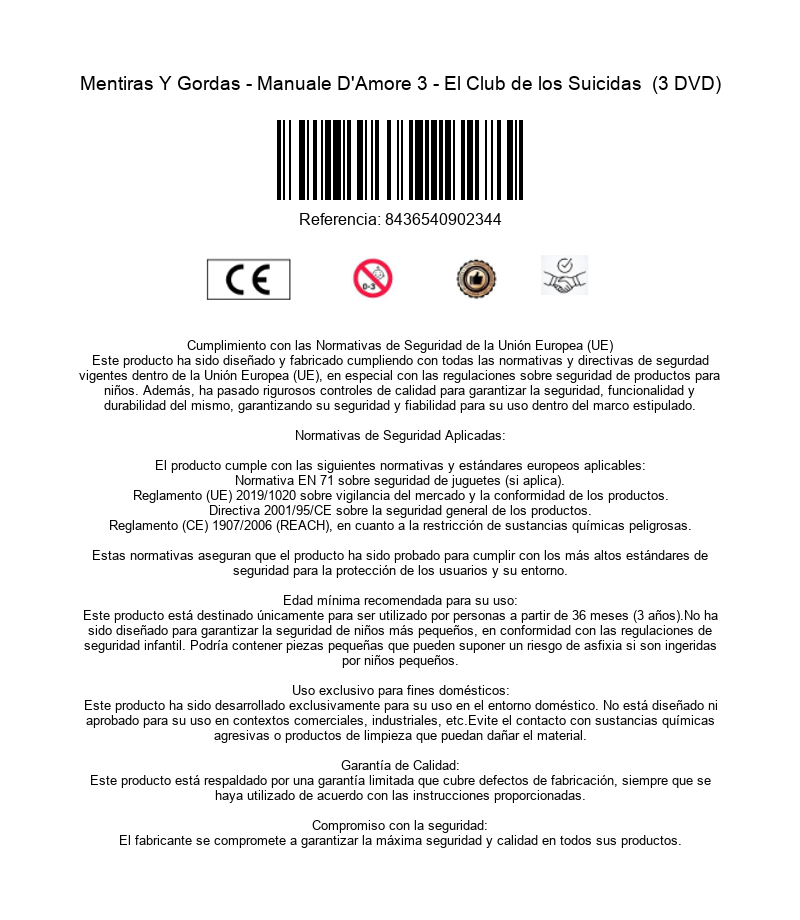 https://dvdstorespain.es/en/films/16003-mentiras-y-gordas-manuale-d-amore-3-el-club-de-los-suicidas-dvd--8436540902344.html16003Mentiras Y Gordas - Manuale D'Amore 3 - El Club De Los Suicidas [DVD]<div><br />Lies and Fats: A group of young people prepares for what is going to be the summer of their lives, between secrets, lies, sex, confusion, night and party. They are not aware that in this initiatory journey, once begun, there is no turning back, that the lies become bigger and bigger and that loving means doing harm. The Suicide Club: Madrid, 2006. An old edition of The novel "The Suicide Club" by Robert Louis Stevenson falls into the hands of a group of men and women who meet in social security therapy for suicides. This group decides to create a club with a very clear objective: kill each other. The mechanism is very simple. They meet one night a week and play cards. He who wins must die. And whoever loses must kill him within seven days. That's when they discover that killing oneself is very complicated, but killing another person is even more difficult.Manuale D'Amore 3:Three new chapters of Manuale d'amore 3 by Giovanni Veronesi, which, on this occasion, focuses its objective in the different ages of love...</div>https://dvdstorespain.es/541481-home_default/mentiras-y-gordas-manuale-d-amore-3-el-club-de-los-suicidas-dvd-.jpg7.4008instockCameo Media,S.L.7.40087.4008002015-06-14T21:12:20+0200/Start/Start/DVD/Start/Films/Start/New/Start/18 YEARS YES D&O