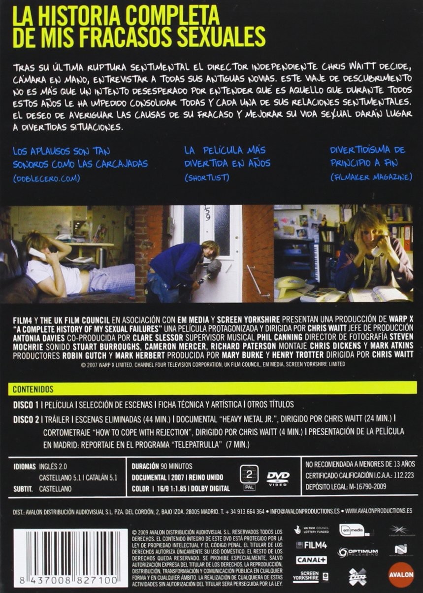 https://dvdstorespain.es/en/films/16477-a-complete-history-of-my-sexual-failures-dvd--8437008827100.html16477A Complete History Of My Sexual Failures [DVD]<div><br />After his latest breakup, the independent director decides, camera in hand, to interview all his old girlfriends. This journey of discovery is nothing more than a desperate attempt to understand what it is that during all these years has prevented him from consolidating each and every one of his romantic relationships. The desire to find out the causes of your failure and improve your sexual life will lead to fun situations.</div>https://dvdstorespain.es/540444-home_default/a-complete-history-of-my-sexual-failures-dvd-.jpg4.876instockKarma Films, S.L.4.8764.876002015-06-14T22:19:14+0200/Start/Start/DVD/Start/Films/Start/NewChris Waitt