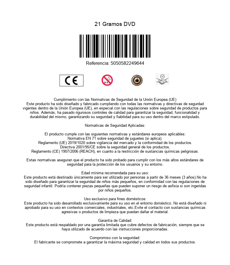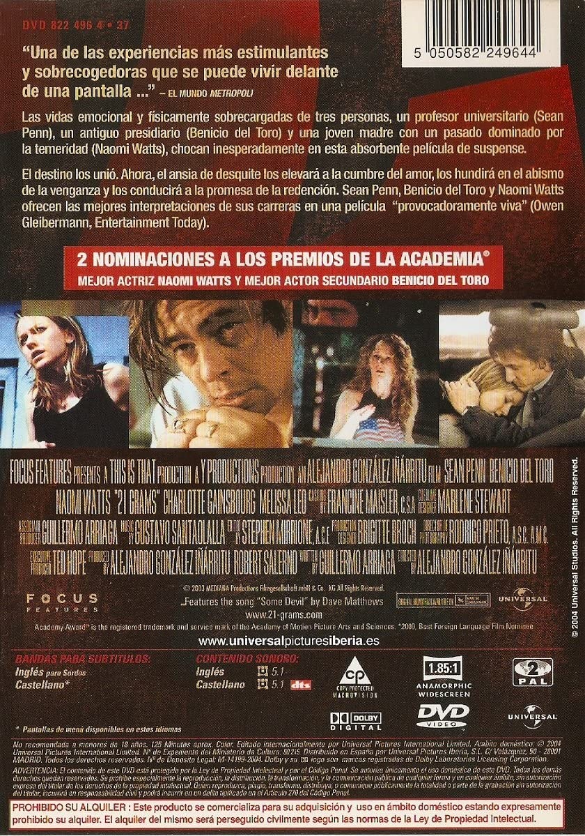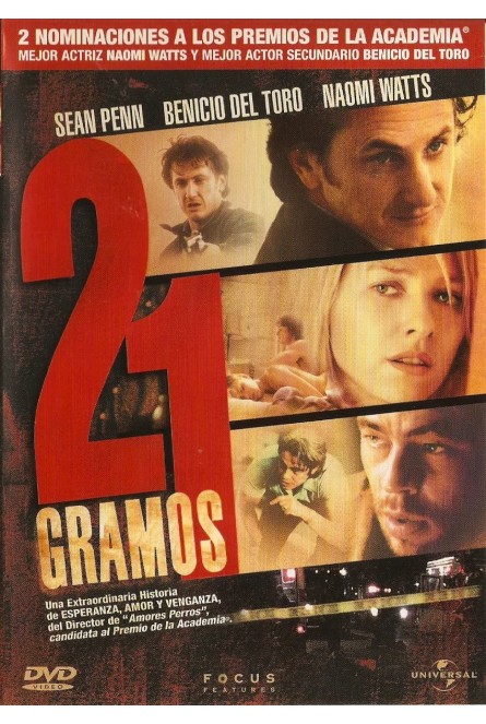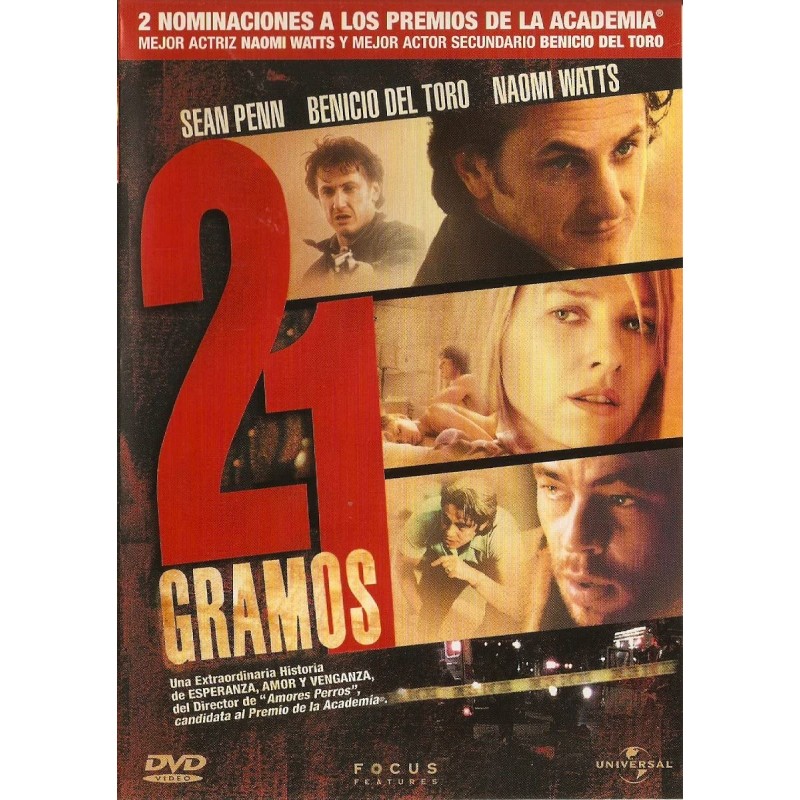 https://dvdstorespain.es/en/films/24261-21-grams-dvd--5050582249644.html2426121 Grams [DVD]<div><br /><p><span>A story of hope and humanity, of misery and survival, that explores the strong emotional and physical sensations of three characters: Paul (Sean Penn), Gato (Benicio Del Toro), and Cristina (Naomi Watts) united by an unexpected accident that makes that their lives and destinies intersect, in a story that leads them to love and revenge. 21 grams refers to the weight we lose when we die, the weight carried by those who survive. (FILMAFINITY)</span></p></div>https://dvdstorespain.es/272577-home_default/21-grams-dvd-.jpg5.7851instockUniversal5.78515.7851002016-02-18T23:00:36+0100/Start/Start/DVD/Start/Films/Start/New