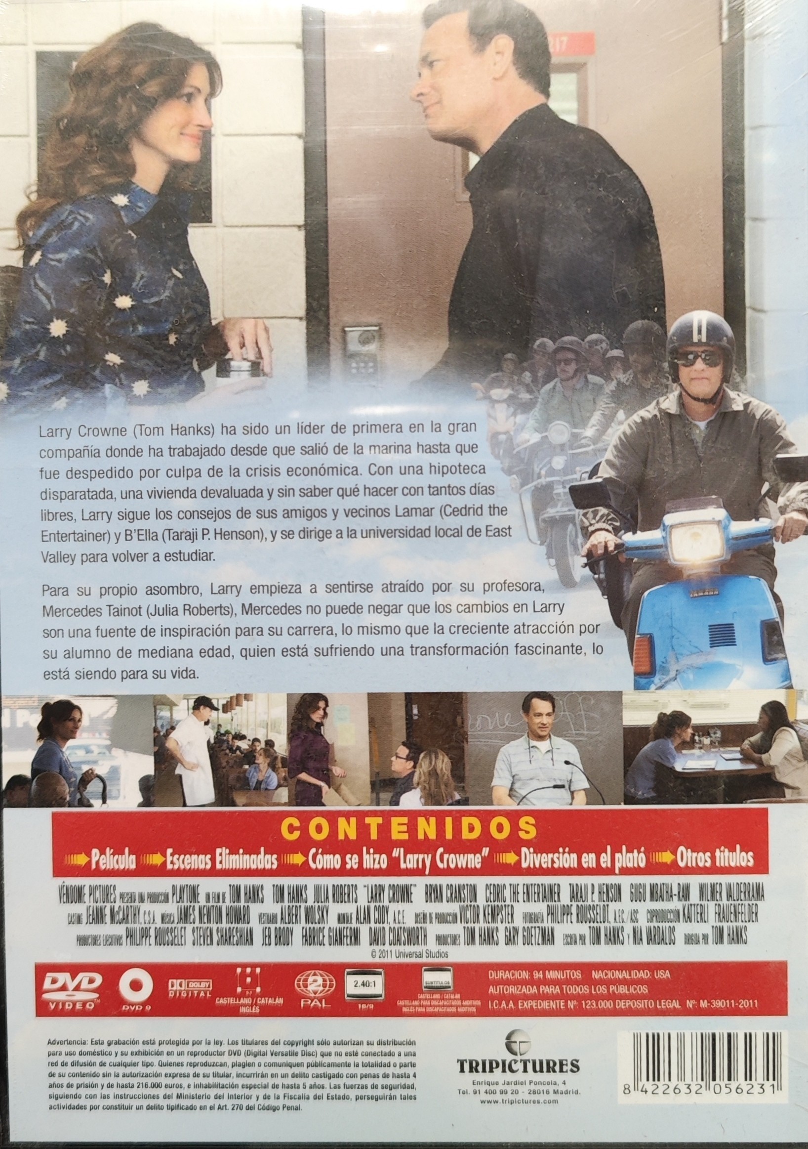 https://dvdstorespain.es/en/films/28122-larry-crowne-nunca-es-tarde-dvd--8422632056231.html28122LARRY CROWNE<div> <br /> hasta que fue despedido, el afable y amigable larry crowne era un líder de primera en una gran compañía, donde trabajó desde que salió de la marina. con una hipoteca disparatada, por una vivienda devaluada, y sin saber qué hacer con tantos días libres, de repente, larry sigue los consejos de su amigos y vecinos y se dirige a una universidad local para volver a empezar. en la universidad comunitaria de east valley, larry se convierte en parte de un pintoresco grupo de estudiantes que se mueven en vespa. todos ellos están intentando ganarse un futuro mejor. para su propio asombro, larry empieza a sentirse atraído por su profesora, mercedes tainot, que ha perdido toda la pasión, tanto por la enseñanza como por el muerto de hambre de su marido. mercedes no puede negar que los cambios en larry son una inspiración, ni tampoco su creciente atracción por su alumno de mediana edad, quien está sufriendo una transformación fascinante. un hombre simple, que tiene todas las razones del mundo para pensar que su vida se ha estancado, acabará aprendiendo una lección inesperada: cuando crees que todo lo que merece la pena ya ha pasado, es posible que descubras tu verdadera razón de ser. </div>https://dvdstorespain.es/679037-home_default/larry-crowne-nunca-es-tarde-dvd-.jpg8.595instock8.5958.595002016-05-13T21:06:31+0200/Start/Start/DVD/Start/Films/Start/New