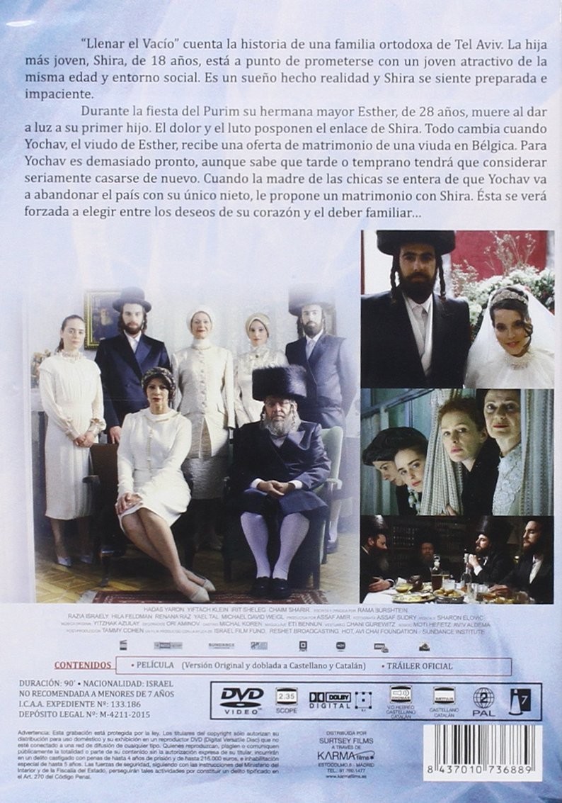 https://dvdstorespain.es/en/films/28734-lemale-et-ha-halal-dvd--8437010736889.html28734Llenar El Vacío [DVD] (2012) Lemale et ha'halal (Fill the Void)Shira es la hija más joven de una familia judía ortodoxa de Tel Aviv. Prometida con un joven de su misma edad, se siente preparada e impaciente. Sin embargo, la muerte de su hermana mayor al dar a luz a su primer hijo, trastoca por completo su futuro: Shira se verá obligada a elegir entre los deseos de su corazón y el deber familiar. https://dvdstorespain.es/269225-home_default/lemale-et-ha-halal-dvd-.jpg4.876instockKarma Films4.8764.876002016-05-23T08:43:06+0200/Start/Start/DVD/Start/Films/Start/New/Start/EVENING SP 70/Start/VELADA DE 80/Start/VELADA FR 80/Start/VELADA IT 80