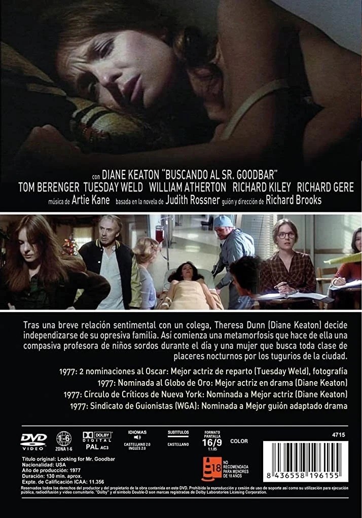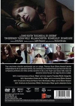 https://dvdstorespain.es/en/films/38845-looking-for-mr-goodbar-dvd--8436558196155.html38845Buscando Al Sr. Goodbar [DVD] (1977) Looking for Mr. GoodbarTras una breve relación sentimental con un colega, Theresa Dunn (Diane Keaton) decide independizarse de su opresiva familia. Así comienza una metamorfosis que hace de ella una compasiva profesora de niños sordos durante el día y una mujer que busca toda clase de placeres nocturnos por los tugurios de la ciudad.https://dvdstorespain.es/513745-home_default/looking-for-mr-goodbar-dvd-.jpg5.9504instockResearch Entertainment5.95045.9504002018-01-19T11:18:42+0100/Start/Start/DVD/Start/Films/Start/New/Start/TRIBUTES/Start/18 YEARS YES D&O/Start/TRIBUTES/Homenaje a Diane Keaton