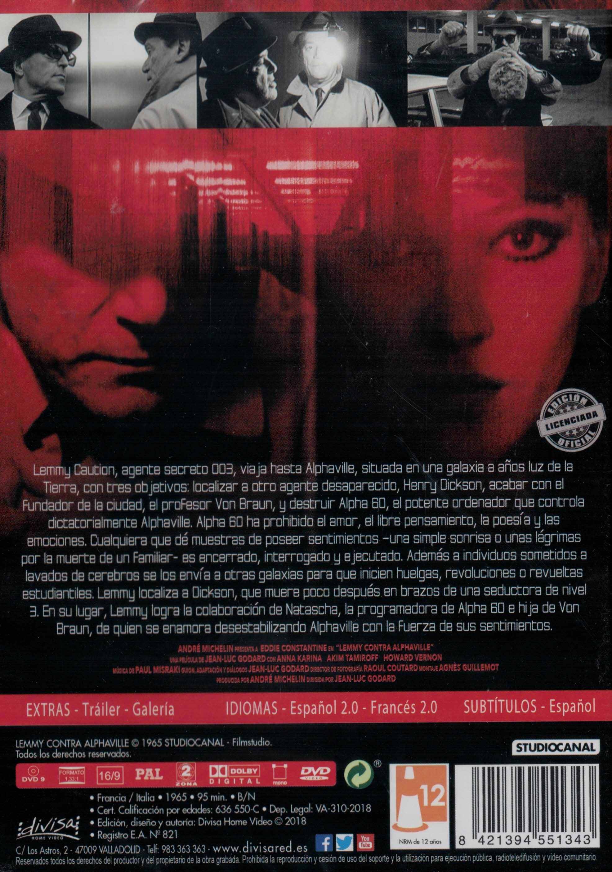 https://dvdstorespain.es/en/films/41989-une-etrange-aventure-de-lemmy-caution-dvd--8421394551343.html41989Une Étrange Aventure De Lemmy Caution [DVD]<div id="productDescription" class="a-section a-spacing-small"><br /><p><span>Lemmy Caution, secret agent 003, travels to Alphaville, located in a galaxy light years from Earth, with three objectives: locate another missing agent, Henry Dickson, kill the city's founder, Professor Von Braun, and destroy Alpha 60, the powerful computer that dictatorially controls Alphaville. Alpha 60 has banned love, free thought, poetry and emotions. Anyone who shows signs of having feelings - a simple smile or a few tears for the death of a family member - is locked up, interrogated and executed. In addition, brainwashed individuals are sent to other galaxies to start strikes, revolutions or student revolts. Lemmy locates Dickson, who dies shortly after in the arms of a level 3 seductress. Instead, Lemmy enlists the collaboration of Natascha, the Alpha 60 programmer and daughter of Von Braun, with whom he falls in love, destabilizing Alphaville with the force of feelings.</span></p></div>https://dvdstorespain.es/501476-home_default/une-etrange-aventure-de-lemmy-caution-dvd-.jpg9.8347instockDivisa Home Video9.83479.8347002018-06-06T23:48:36+0200/Start/Start/DVD/Start/Films/Start/New