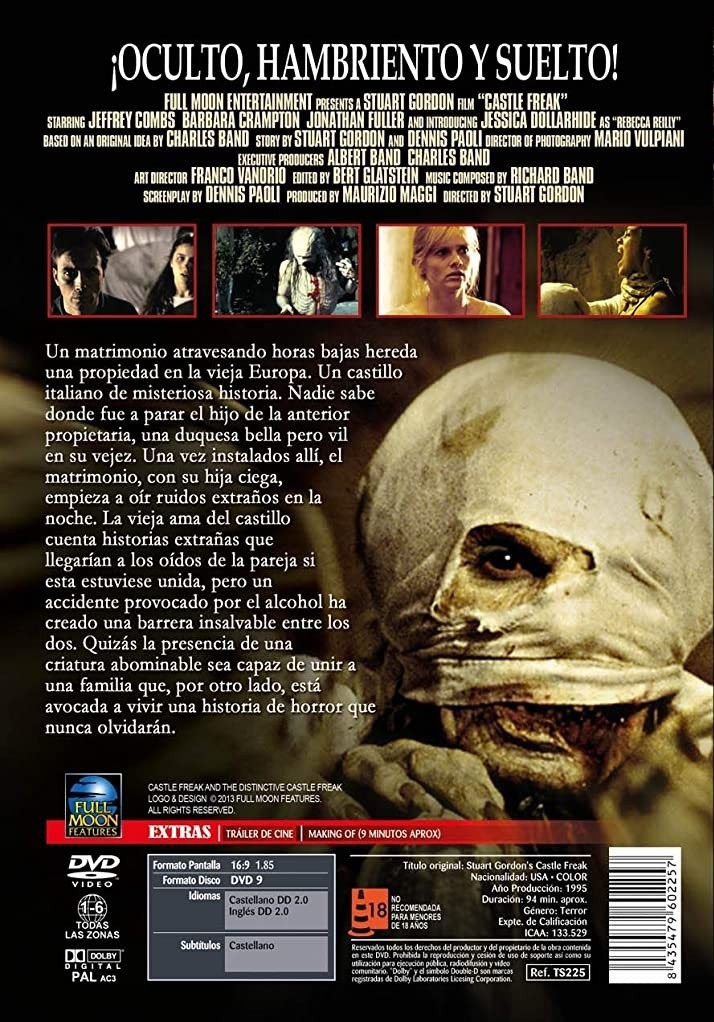 https://dvdstorespain.es/en/films/45174-castle-freak-dvd--8435479602257.html45174Castle Freak [DVD] (1995) Stuart Gordon's Castle FreakUn matrimonio atravesando horas bajas hereda una propiedad en la vieja Europa. Un castillo italiano de misteriosa historia. Nadie sabe donde fue a parar el hijo de la anterior propietaria, una duquesa bella pero vil en su vejez. Una vez instalados allí, el matrimonio, con su hija ciega, empieza a oír ruidos extraños en la noche. La vieja ama del castillo cuenta historias extrañas que llegarían a los oídos de la pareja si está estuviese unida, pero un accidente provocado por el alcohol ha creado una barrera insalvable entre los dos. Quizás la presencia de una criatura abominable sea capaz de unir a una familia que, por otro lado, está avocada a vivir una historia de horror que nunca olvidarán.https://dvdstorespain.es/495645-home_default/castle-freak-dvd-.jpg4.876instockVértice Cine4.8764.876002018-09-28T19:46:41+0200/Start/Start/DVD/Start/Films/Start/New/Start/18 YEARS YES D&O