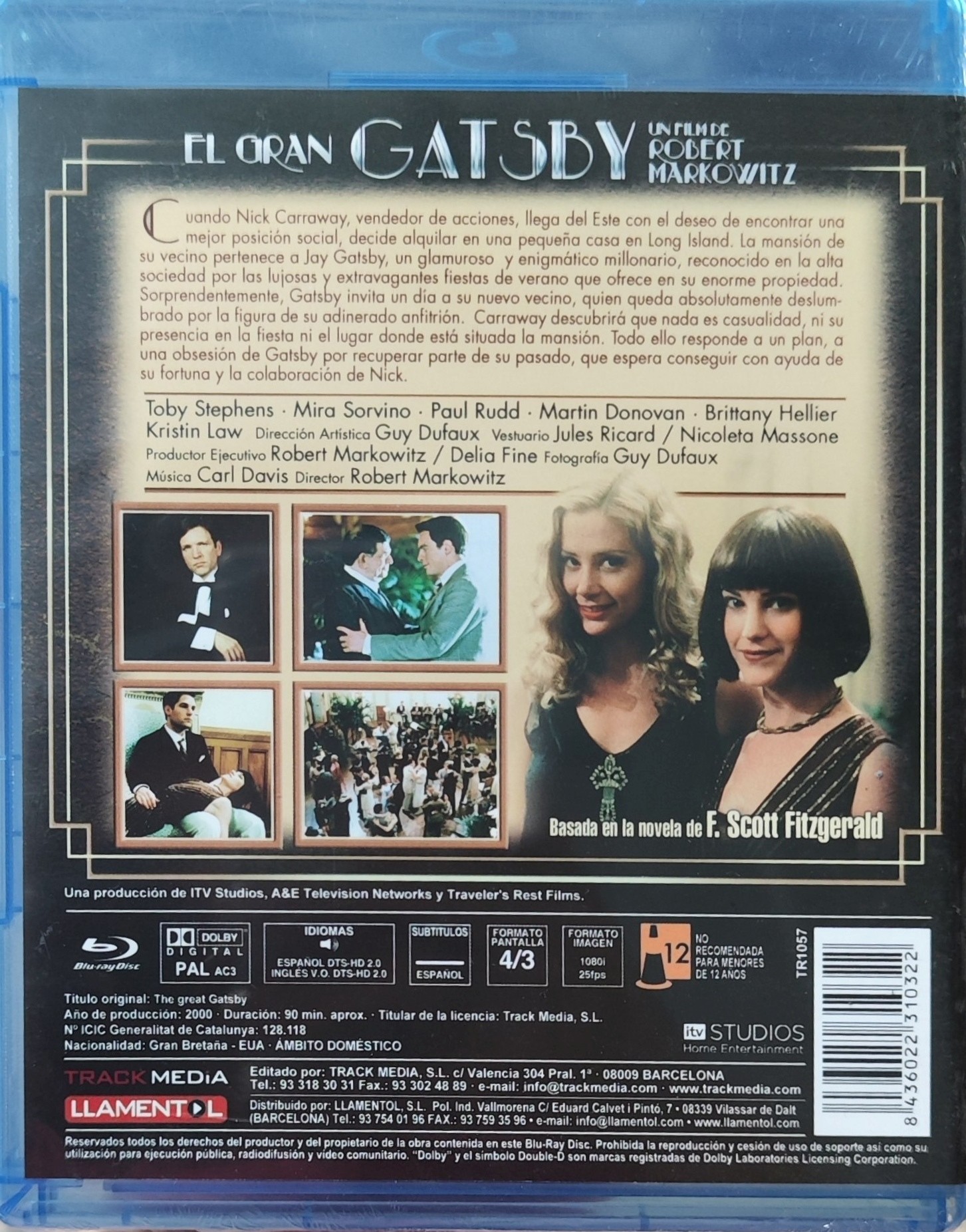 https://dvdstorespain.es/en/films/5312-the-great-gatsby-bluray--8436022310322.html5312The Great Gatsby [BLU_RAY]<div><br />Nick Carraway, a stock salesman, arrives on Long Island with the desire to find a better social position. Carraway decides to settle in a small house, where he has as a neighbor Jay Gatsby, an elegant millionaire with a shady and mysterious past, known in high society for the luxurious parties he gives in his enormous mansion. One day Gatsby invites his new neighbor, and he is absolutely fascinated by the figure of his wealthy host. A meeting that marks the beginning of a friendship that will be strengthened when Nick discovers that Gatsby's true interest is to meet his cousin Daisy, with whom he had a relationship several years ago.</div>https://dvdstorespain.es/554778-home_default/the-great-gatsby-bluray-.jpg5.7025instockLlamentol, S.L.5.70255.7025002015-04-10T21:27:41+0200/Start/Start/Blu-Ray/Start/Films/Start/NewRobert Markowitz