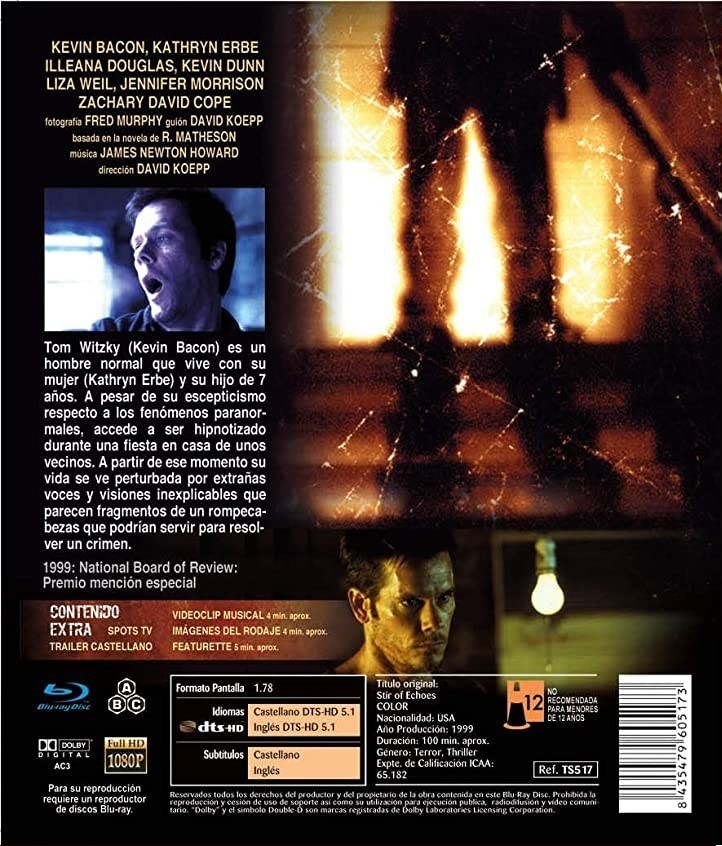https://dvdstorespain.es/en/films/55599-stir-of-echoes-bluray--8435479605173.html55599El Último Escalón [Blu-ray] (1999) Stir of EchoesTom Witzky (Kevin Bacon) es un hombre normal que vive con su mujer (Kathryn Erbe) y su hijo de 7 años. A pesar de su escepticismo respecto a los fenómenos paranormales, accede a ser hipnotizado durante una fiesta en casa de unos vecinos. A partir de ese momento su vida se ve perturbada por extrañas voces y visiones inexplicables que parecen fragmentos de un rompecabezas que podrían servir para resolver un crimen.https://dvdstorespain.es/447924-home_default/stir-of-echoes-bluray-.jpg5.5711instockResearch Entertainment7.95875.571129.9998743513392.38762020-05-14T00:30:39+0200/Start/Start/Blu-Ray/Start/Films/Start/New/Start/EVENING SP 40/Start/VELADA DE 60/Start/VELADA FR 60/Start/VELADA IT 60/Start/ HALLOWEEN SALES/Start/ HALLOWEEN SALES/-30%