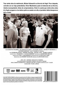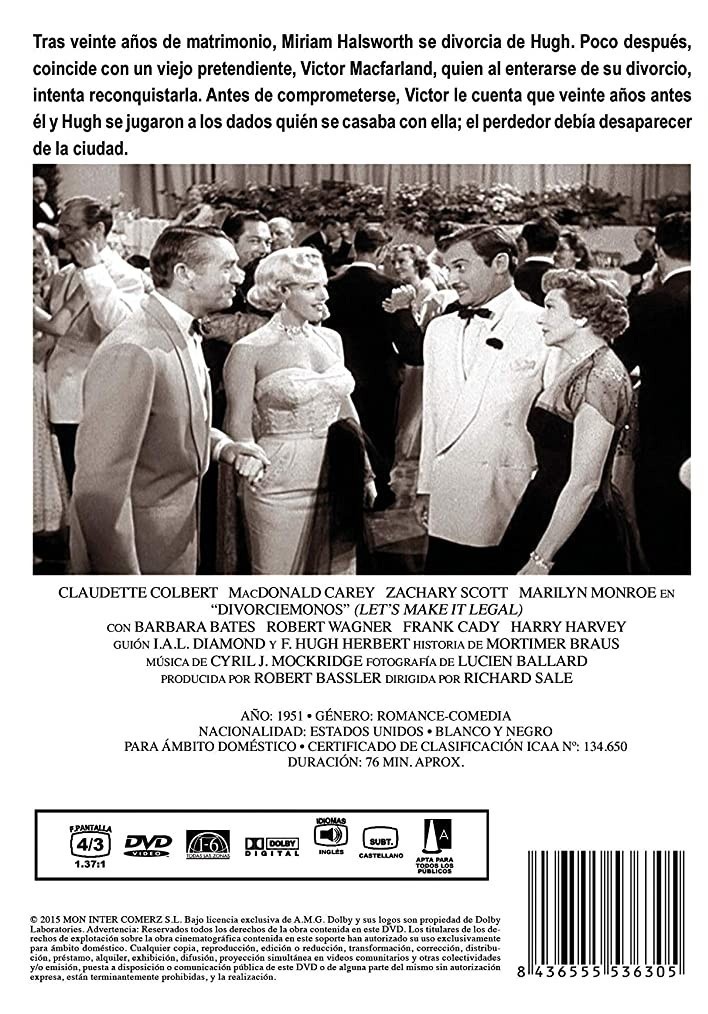 https://dvdstorespain.es/en/films/85801-let-s-make-it-legal-dvd--8436555536305.html85801Divorciémonos [DVD] (1951) Let's Make It LegalTras veinte años de matrimonio, Miriam Halsworth se divorcia de Hugh. Poco después, coincide con un viejo pretendiente, Victor Macfarland, quien al enterarse de su divorcio, intenta reconquistarla. Antes de comprometerse, Victor le cuenta que veinte años antes él y Hugh se jugaron a los dados quién se casaba con ella; el perdedor debía desaparecer de la ciudad. https://dvdstorespain.es/441604-home_default/let-s-make-it-legal-dvd-.jpg4.876instockResearch Entertainment4.8764.876002020-08-29T06:40:59+0200/DVD/Films/New/EVENING SP 70/VELADA DE 80/VELADA FR 80/VELADA IT 80
