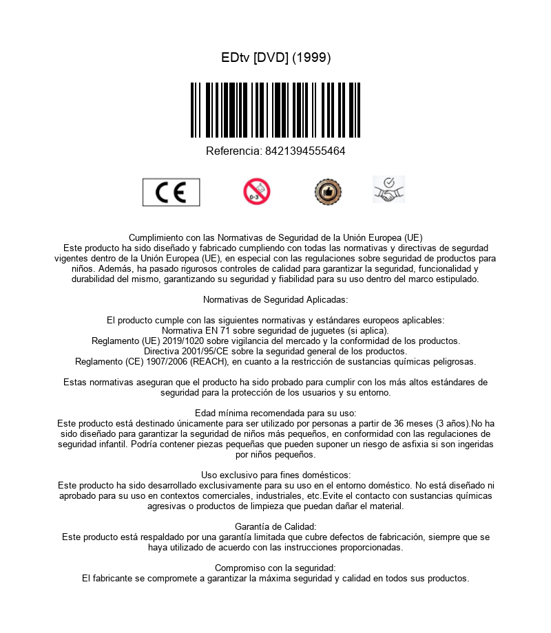https://dvdstorespain.es/en/films/85907-edtv-dvd--8421394555464.html85907Edtv [DVD] (1999)Debido a los bajos índices de audiencia del canal de televisión True TV, a la directora de programación se le ocurre la idea de seguir con una cámara a un ciudadano cualquiera las veinticuatro horas del día. El elegido es un joven sin futuro llamado Ed que vive con su familia en un barrio pobre de San Francisco. El éxito del programa es inmediato pero, con el paso del tiempo, el precio que Ed deberá pagar por la fama será demasiado alto.https://dvdstorespain.es/440804-home_default/edtv-dvd-.jpg7.4298instockDivisa Home Video7.42987.4298002020-09-10T01:11:31+0200/Start/Start/DVD/Start/Films/Start/New/Start/Homenaje a Rob Reiner