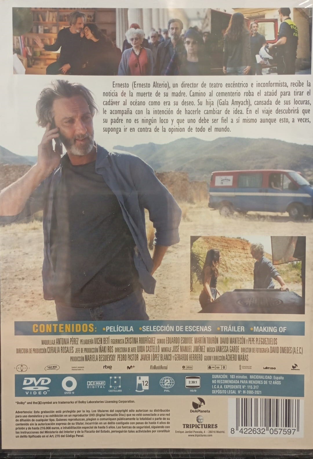 https://dvdstorespain.es/en/films/88169-un-mundo-normal-dvd--8422632057597.html88169Un Mundo Normal [DVD] (2020)Ernesto (Ernesto Alterio), un director de teatro excéntrico e inconformista, recibe la noticia de la muerte de su madre. Camino al cementerio roba el ataúd para tirar el cadáver al océano, como era su deseo. Su hija (Gala Amyach), cansada de sus locuras, le acompaña con la intención de hacerle cambiar de idea. En el viaje descubrirá que su padre no es ningún loco, y que uno debe ser fiel a sí mismo aunque esto, a veces, suponga ir en contra de la opinión de la mayoría.https://dvdstorespain.es/593419-home_default/un-mundo-normal-dvd-.jpg6.5289instockTripictures6.52896.5289002021-03-25T00:05:18+0100/Start/Start/DVD/Start/Films/Start/New/Start/EVENING SP 70/Start/VELADA DE 80/Start/VELADA FR 80/Start/VELADA IT 80