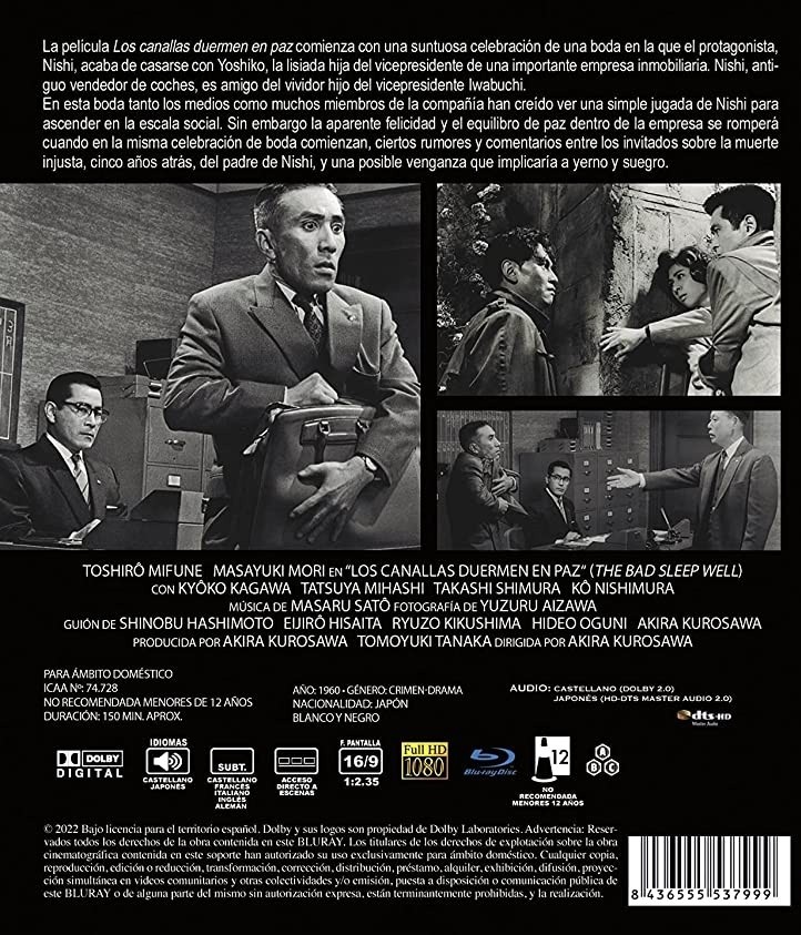 https://dvdstorespain.es/en/films/93519-warui-yatsu-hodo-yoku-nemuru-bluray--8436555537999.html93519Los Canallas Duermen En Paz [Blu-ray] (1960) Warui yatsu hodo yoku nemuru (The Bad Sleep Well)La hija del presidente de una importante empresa inmobiliaria se casa con Nishi, el secretario de su padre. Durante la boda, ciertos rumores y comentarios circulan entre los invitados: cinco años antes, cuando un hombre murió tras caer por la ventana del último piso del edificio de la compañía, mucha gente dudó de la versión oficial, según la cual se había tratado de un suicidio.https://dvdstorespain.es/356088-home_default/warui-yatsu-hodo-yoku-nemuru-bluray-.jpg5.1456instockResearch Entertainment8.5765.1456403.43042022-05-12T01:38:54+0200/Start/Start/Blu-Ray/Start/Films/Start/New/Start/EVENING SP 20/Start/VELADA DE 40/Start/VELADA FR 40/Start/VELADA IT 40/Start/ HALLOWEEN SALES/Start/ HALLOWEEN SALES/-40%