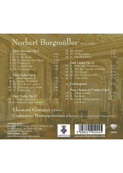The news of Norbert Burgmüller's untimely death, which occurred in 1836 at the age of only 26, was received with profound sadness by his contemporaries Mendelssohn and Schumann, with the latter comparing his death to that of Schubert in a similarly premature manner. In the few years of his career, Burgmüller managed to stand out as one of the greatest talents of his generation and left behind a considerable production, equally divided between orchestral, chamber and vocal works. With this splendid record, Brilliant Classics pays tribute to this genius by presenting his liederistic corpus and the Sonata in F minor Op. 28, a very pleasant page that is clearly influenced by the styles of Weber and Hummel. The lieder, on the other hand, present a freshness and vitality very close to those of Schubert's masterpieces, with the addition of some very original elements, such as certain bold modulations. This album was recorded in the wonderful acoustics of Villa Contucci in Montepulciano by soprano Eleonora Contucci and Costantino Mastroprimiano - a soloist well known to those familiar with the Brilliant Classics catalog - who plays an extraordinary Graf fortepiano from 1826, always owned by the family Contucci. The album is accompanied by extensive notes in the margins, the lyrics of the lieder and a detailed presentation of the instrument. Eleonora Contucci, soprano
