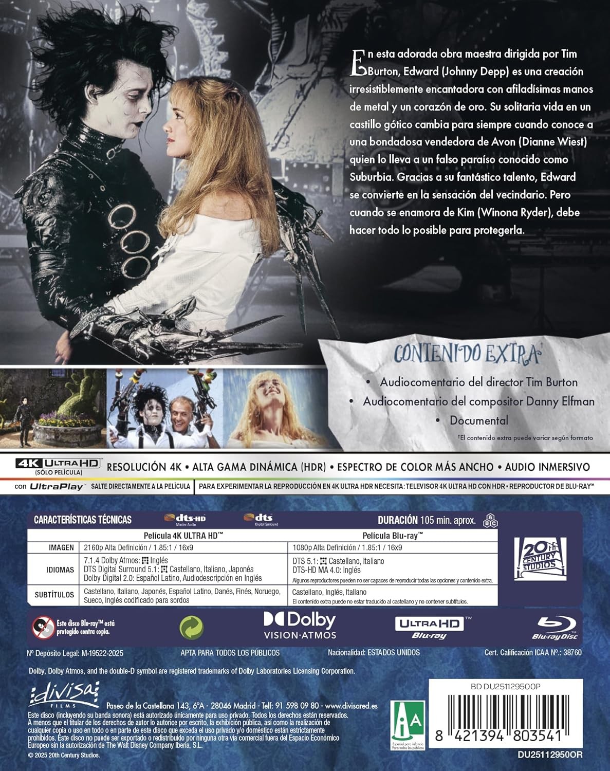 https://dvdstorespain.es/en/presale/127225-eduardo-manostijeras-edward-scissorhands-1990-tim-burton-4k-uhd-blu-ray-blu-ray-2025--8421394803541.html127225Eduardo Manostijeras [4K UHD, Blu-ray] (1990) Edward ScissorhandsDurante una noche de Navidad, una anciana le cuenta a su nieta la historia de Eduardo Manostijeras (Johnny Depp), un muchacho creado por un extravagante inventor (Vincent Price) que no pudo acabar su obra, dejando al joven con cuchillas en lugar de dedos. https://dvdstorespain.es/1088432-home_default/eduardo-manostijeras-edward-scissorhands-1990-tim-burton-4k-uhd-blu-ray-blu-ray-2025-.jpg21.4876instockDivisa HV - Disney21.487621.4876002025-10-10T21:30:42+0200/Start/Start/Films/Start/4K-UHD/Start/Presale