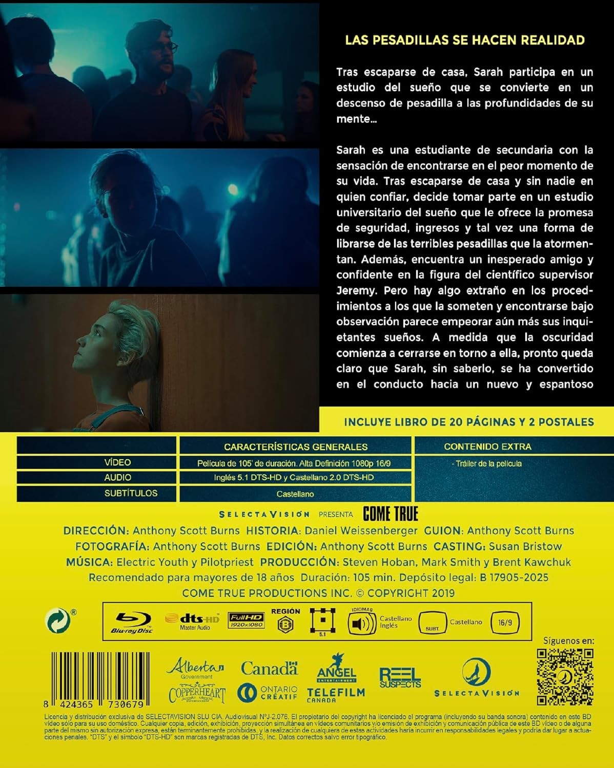 https://dvdstorespain.es/en/presale/127675-come-true-pelicula-bluray-blu-ray-2025--8424365730679.html127675Come True [Blu-ray] (2020)Sarah es una estudiante adolescente que toca fondo anímicamente tras huir de casa. Una vez sola, no tiene a nadie que le ayude a superar sus recurrentes pesadillas. Su única oportunidad de sobrevivir pasa por participar en un estudio universitario en la que entabla amistad con el científico supervisor, llamado Jeremy. Sin embargo, hay algo extraño en el procedimiento al que se somete, y con el paso de los días las pesadillas de Sarah empiezan a empeorar. https://dvdstorespain.es/1096974-home_default/come-true-pelicula-bluray-blu-ray-2025-.jpg13.2231instockSELECTA VISION13.223113.2231002025-11-04T01:45:26+0100/Start/Start/Blu-Ray/Start/Films/Start/Presale