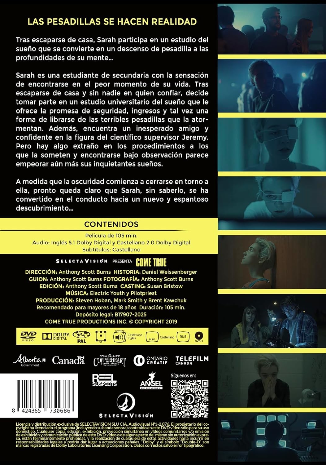 https://dvdstorespain.es/en/presale/127676-come-true-pelicula-dvd-2025--8424365730686.html127676Come True [DVD] (2020)Sarah es una estudiante adolescente que toca fondo anímicamente tras huir de casa. Una vez sola, no tiene a nadie que le ayude a superar sus recurrentes pesadillas. Su única oportunidad de sobrevivir pasa por participar en un estudio universitario en la que entabla amistad con el científico supervisor, llamado Jeremy. Sin embargo, hay algo extraño en el procedimiento al que se somete, y con el paso de los días las pesadillas de Sarah empiezan a empeorar. https://dvdstorespain.es/1096978-home_default/come-true-pelicula-dvd-2025-.jpg9.9174instockSELECTA VISION9.91749.9174002025-11-04T01:45:38+0100/Start/Start/DVD/Start/Films/Start/Presale