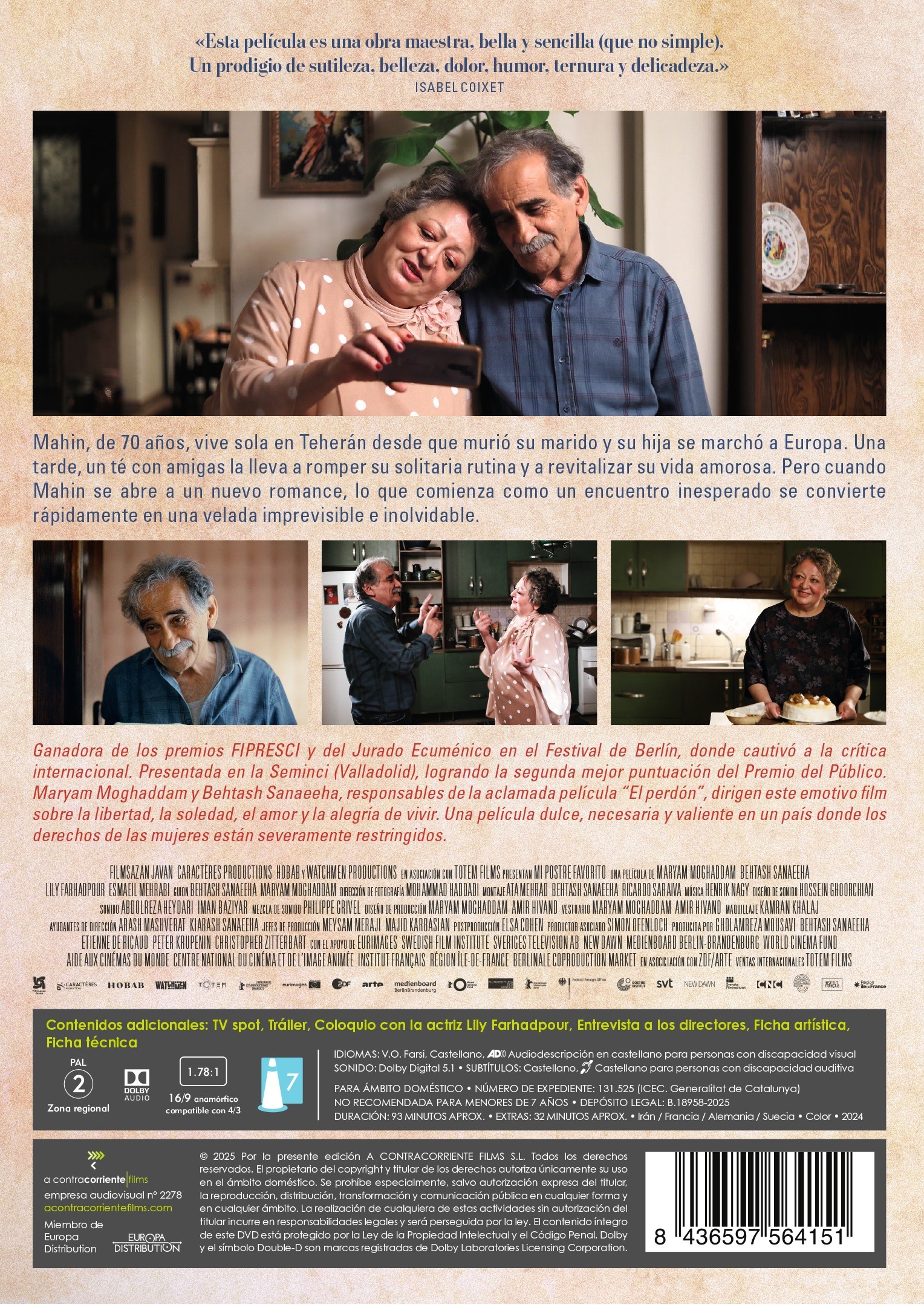 https://dvdstorespain.es/en/presale/127691-mi-postre-favorito-dvd-2025--8436597564151.html127691Mi Postre Favorito [DVD] (2024) Keyke mahboobe manMahin, de 70 años, vive sola en Teherán desde que murió su marido y su hija se mudó a Europa. Desde su independencia, Mahin desafía las expectativas de su entorno conservador. Más aún cuando inesperadamente conoce y empieza una relación amorosa con un taxista llamado Faramarz.https://dvdstorespain.es/1100478-home_default/mi-postre-favorito-dvd-2025-.jpg12.3141instockA Contracorriente Films, S.L.12.314112.3141002025-11-04T13:16:08+0100/Start/Start/DVD/Start/Films/Start/Presale