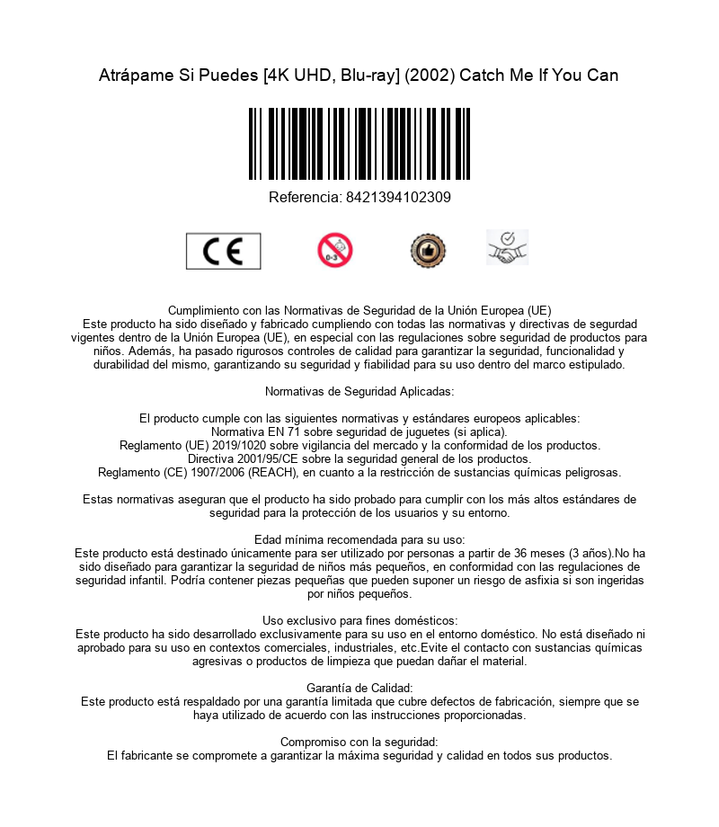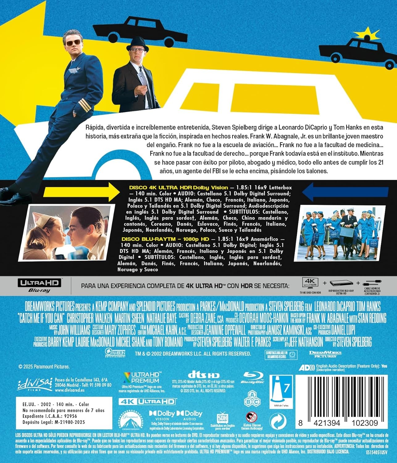 https://dvdstorespain.es/en/presale/127838-atrapame-si-puedes-catch-me-if-you-can-2002-steven-spielberg-4k-uhd-blu-ray-blu-ray-2025--8421394102309.html127838Atrápame Si Puedes [4K UHD, Blu-ray] (2002) Catch Me If You CanBasada en una historia real. En los años sesenta, Frank W. Abagnale (Leonardo DiCaprio) era un joven y escurridizo delincuente que adoptaba diversas identidades (médico, abogado o copiloto de líneas aéreas). Carl Hanratty (Tom Hanks), un agente del FBI, tenía la misión de seguir su pista y capturarlo para llevarlo ante la justicia, pero Frank siempre iba un paso por delante de él. https://dvdstorespain.es/1099901-home_default/atrapame-si-puedes-catch-me-if-you-can-2002-steven-spielberg-4k-uhd-blu-ray-blu-ray-2025-.jpg21.9008instockDivisa HV - Paramount21.900821.9008002025-11-12T09:31:06+0100/Start/Start/Films/Start/4K-UHD/Start/Presale