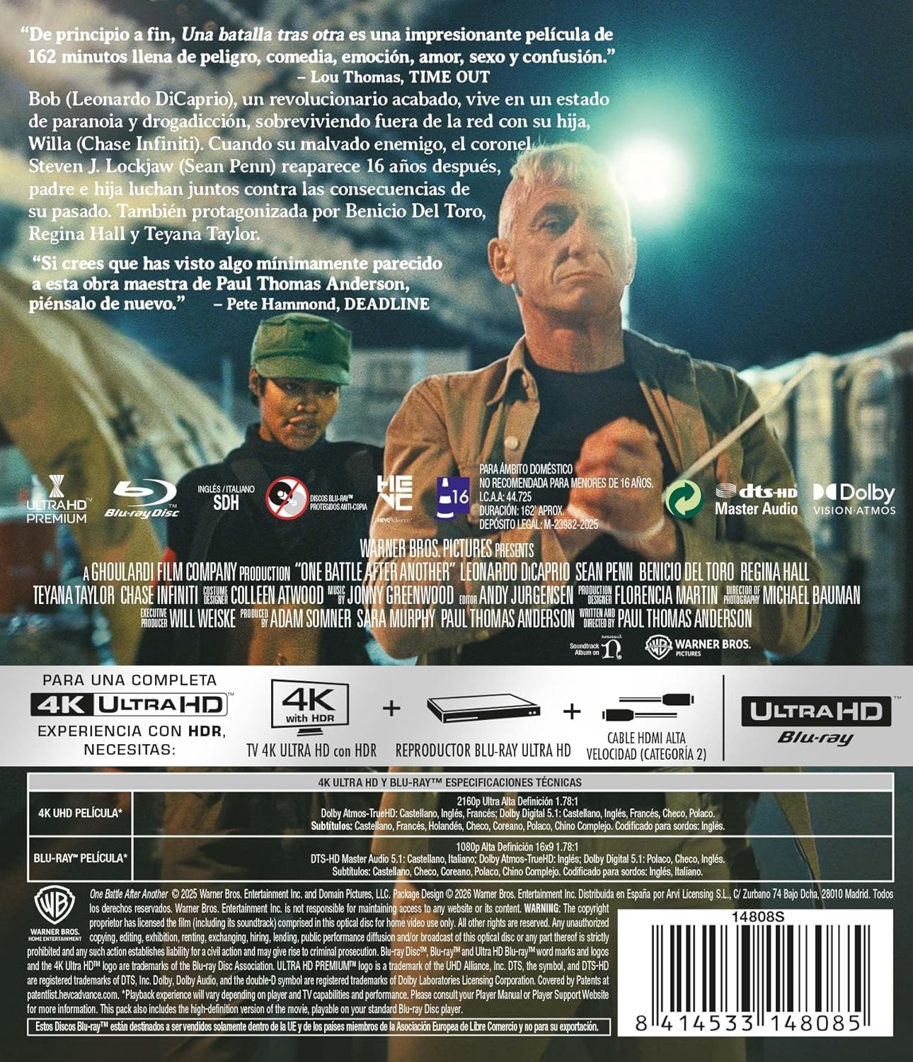 https://dvdstorespain.es/en/presale/128433-una-batalla-tras-otra-4k-uhd-bd-blu-ray-2026--8414533148085.html128433Una Batalla Tras Otra [4K UHD, Blu-ray ] (2025) One Battle After AnotherUn ex revolucionario, tras años apartado de la lucha, se ve obligado a volver a la acción para enfrentar a viejos enemigos en un ambiente cargado de tensión política, racismo y violencia militar... Adaptación modernizada de la novela 'Vineland', de Thomas Pynchon (1990), sobre los movimientos radicales de los años sesenta.https://dvdstorespain.es/1112316-home_default/una-batalla-tras-otra-4k-uhd-bd-blu-ray-2026-.jpg22.2314instockARVI22.231422.2314002025-12-20T06:31:03+0100/Start/Start/Films/Start/4K-UHD/Start/Presale