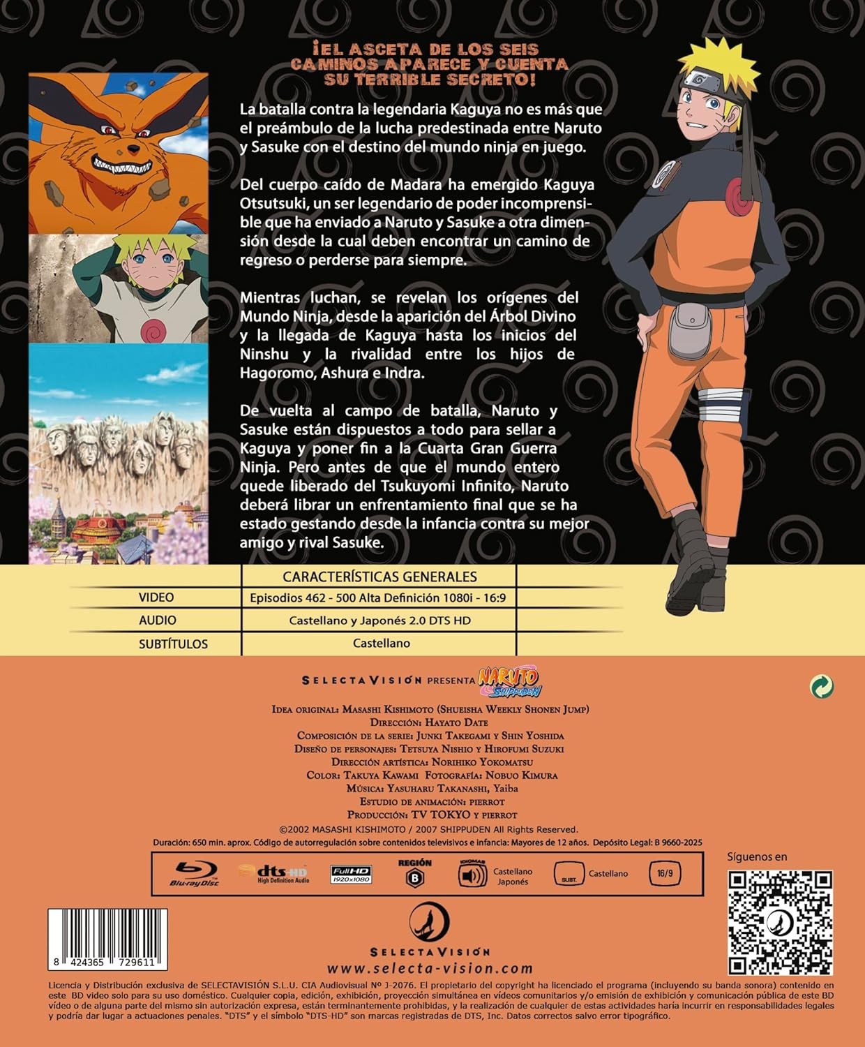 Serie de TV (2007-2017). 502 episodios. La historia rodea a un mayor y un poco más maduro Naruto Uzumaki y su aventura para rescatar a su amigo Sasuke Uchiha de las garras del Orochimaru, antes de que este utilize el cuerpo de su amigo. Sakura también se unirá a su viaje, por la que comienza a entrenar con Tsunade. Tras 2 años y medio entrenando con Jiraiya, Naruto regresa a Konoha, y se decide alcanzar su sueño de una buena vez, aunque no será nada fácil. Ahora ha formado más enemigos dentro de la Organización Shinobi, Akatsuki; que siguen buscando el demonio en su interior. Ahora, 3 años después de los eventos de "Naruto", el viaje del muchacho para volverse Hokage continúa...