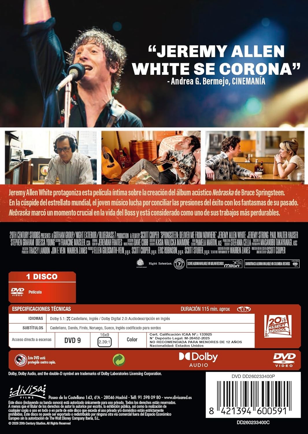https://dvdstorespain.es/en/presale/128499-springsteen-deliver-me-from-nowhere-dvd-dvd-2026--8421394600591.html128499Springsteen: Deliver Me From Nowhere [DVD] (2025)Adaptación cinematográfica del relato de Warren Zanes sobre la grabación del álbum "Nebraska", de Bruce Springsteen, de 1982. La película sigue a 'The Boss' cuando era un joven músico en los albores de la fama mundial, tratando de reconciliar las presiones del éxito con los fantasmas de su pasado. Grabado en un viejo cassette de cuatro pistas en su habitación en Nueva Jersey, 'Nebraska' refleja un periodo trascendental de su vida y está lleno de personajes perdidos en busca de una razón para creer.https://dvdstorespain.es/1113603-home_default/springsteen-deliver-me-from-nowhere-dvd-dvd-2026-.jpg15.7025instock15.702515.7025002025-12-24T01:45:41+0100/Start/Start/DVD/Start/Films/Start/Presale