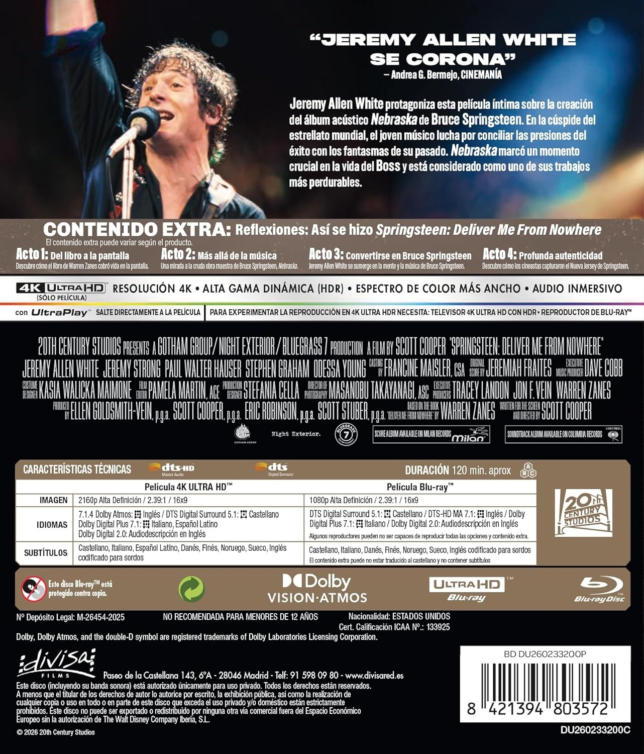 https://dvdstorespain.es/en/presale/128500-springsteen-deliver-me-from-nowhere-4k-uhd-blu-ray-blu-ray-2026--8421394803572.html128500Springsteen: Deliver Me From Nowhere [4K UHD, Blu-ray] (2025)Adaptación cinematográfica del relato de Warren Zanes sobre la grabación del álbum "Nebraska", de Bruce Springsteen, de 1982. La película sigue a 'The Boss' cuando era un joven músico en los albores de la fama mundial, tratando de reconciliar las presiones del éxito con los fantasmas de su pasado. Grabado en un viejo cassette de cuatro pistas en su habitación en Nueva Jersey, 'Nebraska' refleja un periodo trascendental de su vida y está lleno de personajes perdidos en busca de una razón para creer.https://dvdstorespain.es/1113608-home_default/springsteen-deliver-me-from-nowhere-4k-uhd-blu-ray-blu-ray-2026-.jpg21.4876instock21.487621.4876002025-12-24T01:45:54+0100/Start/Start/Films/Start/4K-UHD/Start/Presale