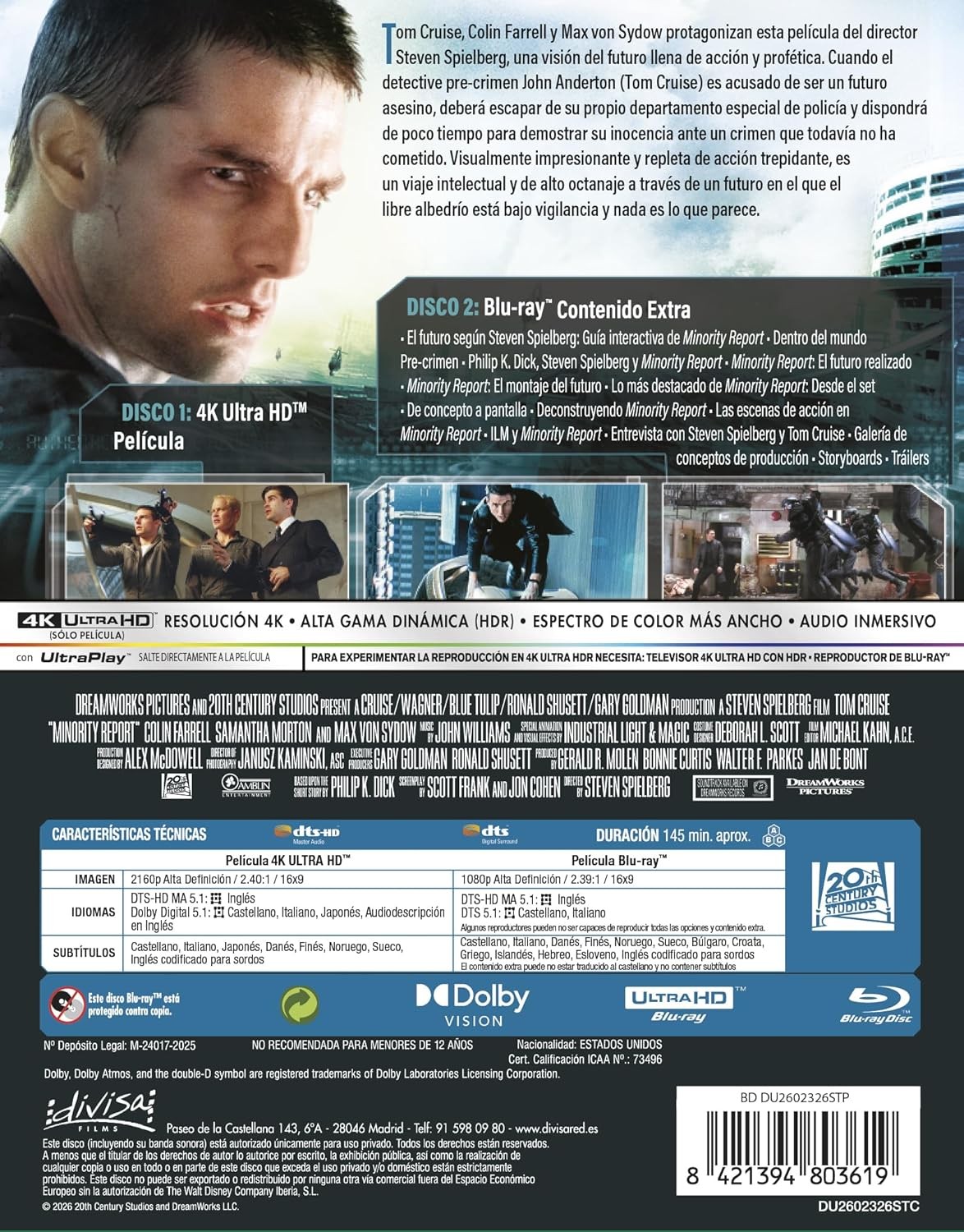 https://dvdstorespain.es/en/presale/128502-minority-report-steelbook-2002-steven-spielberg-4k-uhd-blu-ray-blu-ray-2026--8421394803619.html128502Minority Report (Steelbook) [4K UHD, Blu-ray] (2002)Washington DC, año 2054. La policía utiliza tecnología psíquica para arrestar y enjuiciar a los asesinos antes de que cometan un crimen. El futuro se puede predecir y los culpables son detenidos por la unidad de élite Precrime antes de que puedan delinquir. Las pruebas se basan en los "precogs", tres seres psíquicos cuyas visiones sobre los asesinatos nunca han fallado. https://dvdstorespain.es/1113617-home_default/minority-report-steelbook-2002-steven-spielberg-4k-uhd-blu-ray-blu-ray-2026-.jpg32.9752instock32.975232.9752002025-12-24T01:46:16+0100/Start/Start/Films/Start/TV series/Start/4K-UHD/Start/Presale