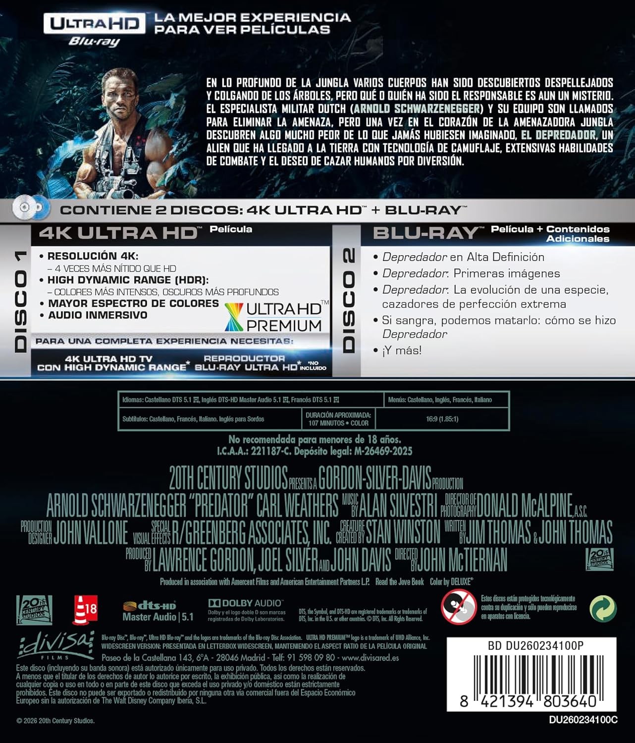 https://dvdstorespain.es/en/presale/128503-depredador-predator-1987-john-mctiernan-4k-uhd-blu-ray-blu-ray-2026--8421394803640.html128503Depredador [4K UHD, Blu-ray] (1987) PredatorUn grupo de mercenarios es contratado por la CIA para rescatar a unos pilotos que han sido apresados por la guerrilla en la selva centroamericana. La misión es un éxito, pero durante el viaje de regreso se dan cuenta de que algo misterioso e invisible está dándoles caza uno a uno. Ese algo resulta ser un cazador alienígena que se queda con las calaveras de sus víctimas como trofeos. https://dvdstorespain.es/1113621-home_default/depredador-predator-1987-john-mctiernan-4k-uhd-blu-ray-blu-ray-2026-.jpg15.7025instock15.702515.7025002025-12-24T01:46:21+0100/Start/Start/Films/Start/TV series/Start/4K-UHD/Start/Presale
