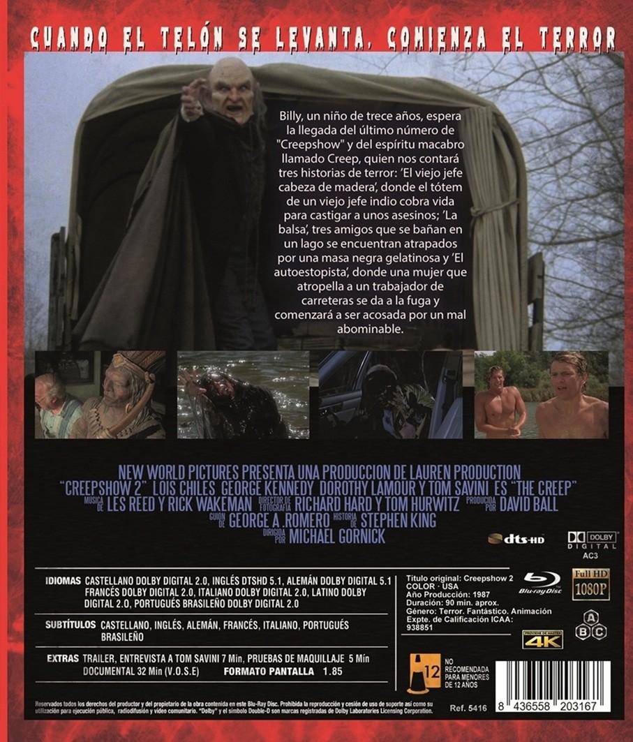 https://dvdstorespain.es/en/presale/128563-creepshow-2-nueva-edicion-blu-ray-1987-creepshow-ii-blu-ray-2026--8436558203167.html128563Creepshow 2 (Nueva edición) [Blu-ray] (1987)Billy, un niño de trece años, espera la llegada del último número de "Creepshow" y del espíritu macabro llamado Creep, quien nos contará tres historias de terror: ’El viejo jefe cabeza de madera’, donde el tótem de un viejo jefe indio cobra vida para castigar a unos asesinos; ’La balsa’, tres amigos que se bañan en un lago se encuentran atrapados por una masa negra gelatinosa y ’El autoestopista’, donde una mujer que atropella a un trabajador de carreteras se da a la fuga y comenzará a ser acosada por un mal abominable.https://dvdstorespain.es/1115322-home_default/creepshow-2-nueva-edicion-blu-ray-1987-creepshow-ii-blu-ray-2026-.jpg10.7025instock10.702510.7025002025-12-27T01:16:33+0100/Start/Start/Blu-Ray/Start/Films/Start/TV series/Start/Presale