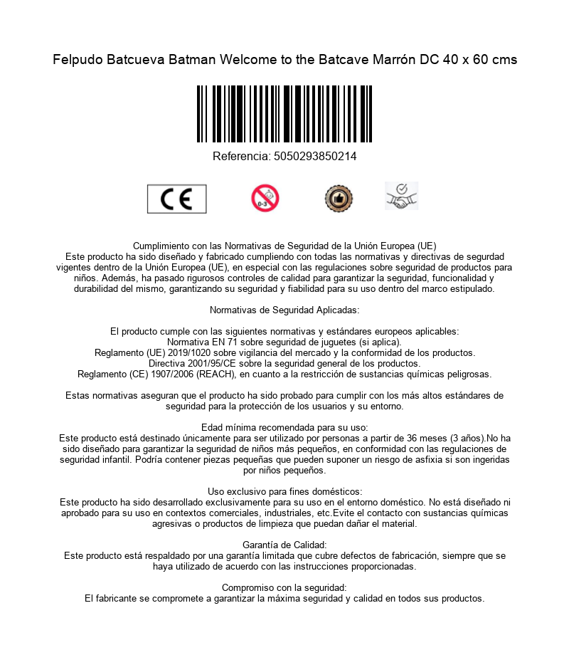 https://dvdstorespain.es/en/top-ventas/101395-batcave-doormat-batman-welcome-to-the-batcave-brown-dc-40-x-60-cm-5050293850214.html101395Felpudo Batcueva Batman Welcome to the Batcave Marrón DC 40 x 60 cmsFeel like you're entering your own Batcave with this spectacular officially licensed DC doormat. The classic Bat-Man symbol is depicted in black on a light brown background. The phrase 'Welcome to the Batcave' surrounds the mythical symbol and will welcome all your guests. It measures approximately 60 x 40 cm and has been made with thick coconut fiber 15 mm thick. To make it more resistant, the back is made of vinyl, so you can use it both outdoors and indoors. In addition, it has a practical plastic handle for easy transportation. One of the most practical and attractive gifts for fans of Batman and DC comics.https://dvdstorespain.es/583846-home_default/batcave-doormat-batman-welcome-to-the-batcave-brown-dc-40-x-60-cm.jpg8.1818instockPyramid8.18188.1818002022-12-21T01:10:11+0100/Start/Start/Cinema, Series and Video Games Merchandising/Start/New/Start/Cinema, Series and Video Games Merchandising/Doormats/Start/UNIVERSO BATMAN/Start/AMIGO INVISIBLE
