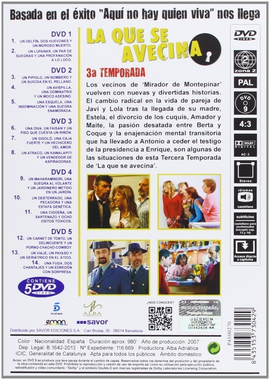 https://dvdstorespain.es/en/tv-series/25696-la-que-se-avecina-dvd--8435153730429.html25696La Que Se Avecina (Temporada 3) [DVD] (2007)Serie de TV (2007- ). 15 temporadas. Tras el enorme éxito en Antena 3 de la serie "Aquí no hay quien viva", que narraba la vida y milagros de los miembros de una comunidad de vecinos, Tele 5 contrató a muchos de los actores e hizo una serie de formato y argumento semejante sobre los variopintos vecinos de Mirador de Montepinar, un complejo residencial situado en la periferia de una gran ciudad. Entre ellos destacan una familia caótica, unos recién casados, una "Bridget Jones" española, el "pesado oficial" del vecindario, dos prejubilados, un antisocial, un mileurista, un galán de telenovela, dos okupas y un matrimonio con niños. https://dvdstorespain.es/776536-home_default/la-que-se-avecina-dvd-.jpg11.5702instock11.570211.5702002016-03-21T08:22:03+0100/TV series