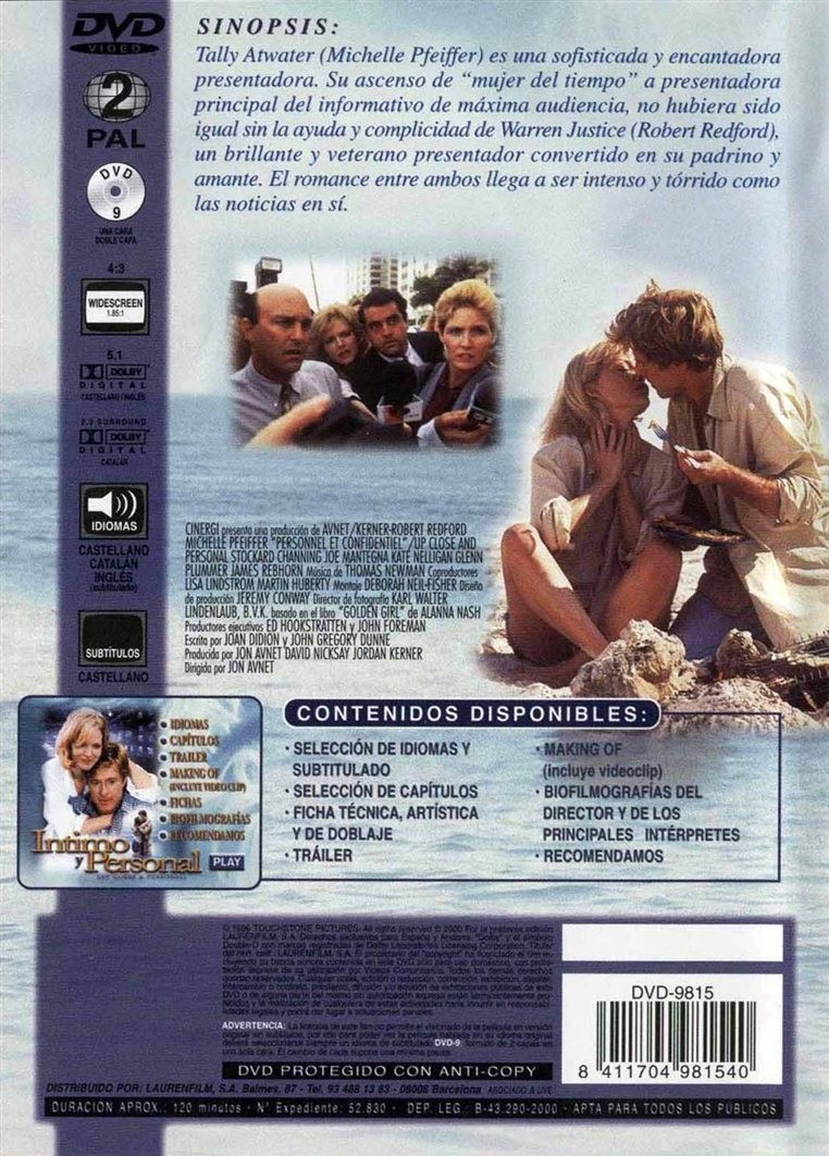 https://dvdstorespain.es/es/homenajes/2355-intimo-y-personal-1996-dvd-up-close-personal-8411704981540.html2355Íntimo Y Personal [DVD] (1996) Up Close & PersonalTally Atwater (Michelle Pfieffer) es una desconocida y ambiciosa periodista que comienza a trabajar en un canal de noticias de Miami a las órdenes de Warren Justice (Robert Redford), un veterano presentador y antiguo corresponsal en la Casa Blanca. Tras conseguir presentar el tiempo y posteriormente hacer directos, la carrera de Tally se dispara y llega a presentar un informativo de máxima audiencia. Al tiempo, surge una relación sentimental entre ella y Warren.https://dvdstorespain.es/1079376-home_default/intimo-y-personal-1996-dvd-up-close-personal.jpg4.9587instock4.95874.9587002015-04-08T23:23:37+0200/Inicio/Inicio/DVD/Inicio/Películas/Inicio/Nuevos/Inicio/HOMENAJES/Inicio/VELADA SP 70/Inicio/VELADA DE 100/Inicio/VELADA FR 100/Inicio/VELADA IT 100/Inicio/HOMENAJES/Homenaje a Robert Redford