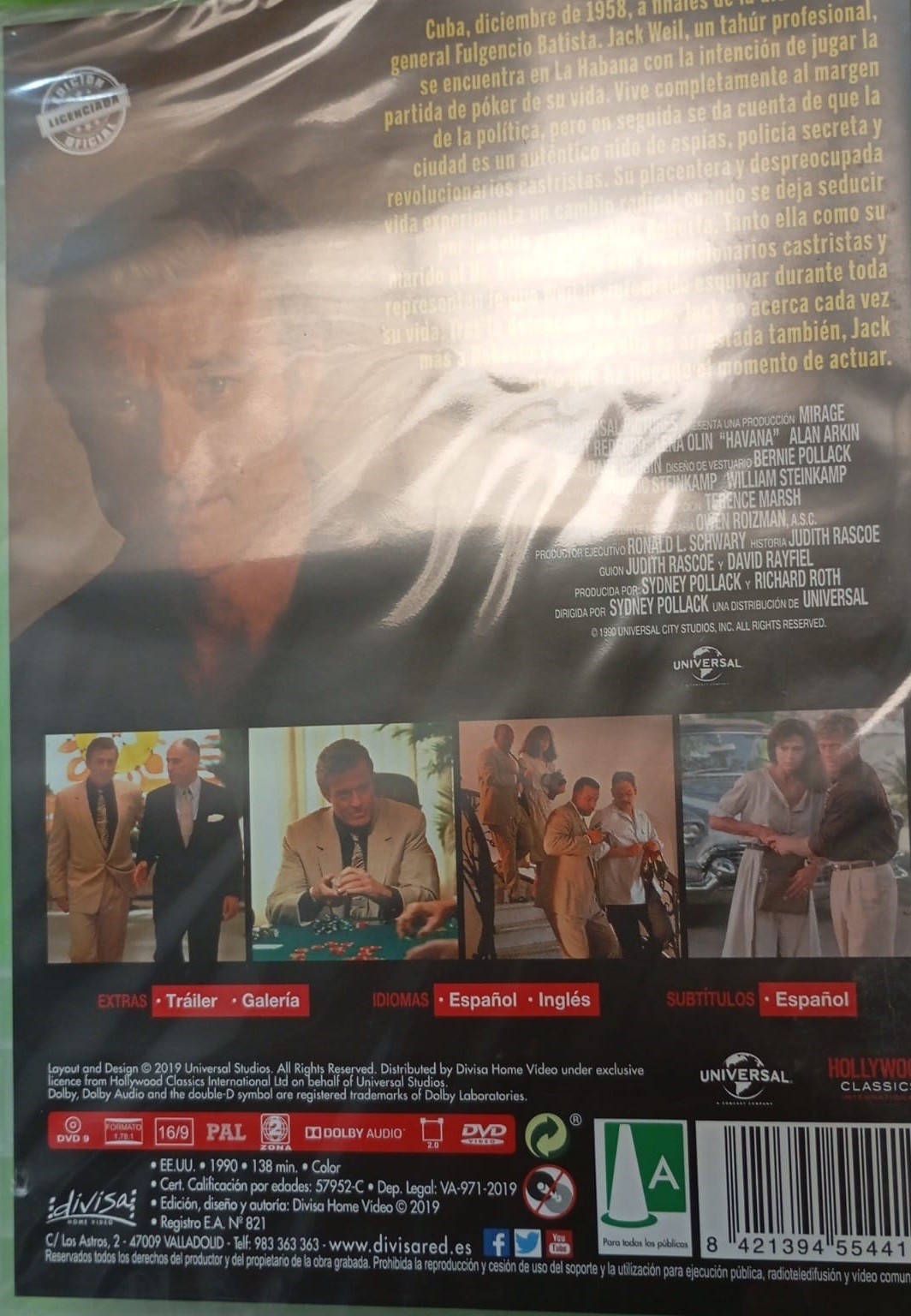 https://dvdstorespain.es/es/homenajes/53595-habana-dvd-dvd--8421394554412.html53595Habana [DVD] (1990) HavanaCuba, 1958, durante la dictadura del general Batista. Jack Weil (Robert Redford), un tahúr profesional, se encuentra en La Habana con la intención de jugar la partida de póker de su vida. Vive completamente al margen de la política, pero en seguida se da cuenta de que la ciudad es un auténtico nido de espías, policía secreta y revolucionarios castristas. En vísperas de la revolución de 1959, su placentera y despreocupada vida experimenta un cambio radical al dejarse seducir por Roberta (Lena Olin), pues tanto ella como su marido (Raúl Juliá) son castristas y representan lo que Weil ha intentado esquivar durante toda su vida.https://dvdstorespain.es/459657-home_default/habana-dvd-dvd-.jpg9.0083instockDivisa Home Video9.00839.0083002019-12-09T10:40:41+0100/Inicio/Inicio/DVD/Inicio/Películas/Inicio/Nuevos/Inicio/HOMENAJES/Inicio/VELADA SP 70/Inicio/VELADA DE 100/Inicio/VELADA FR 100/Inicio/VELADA IT 100/Inicio/HOMENAJES/Homenaje a Robert Redford