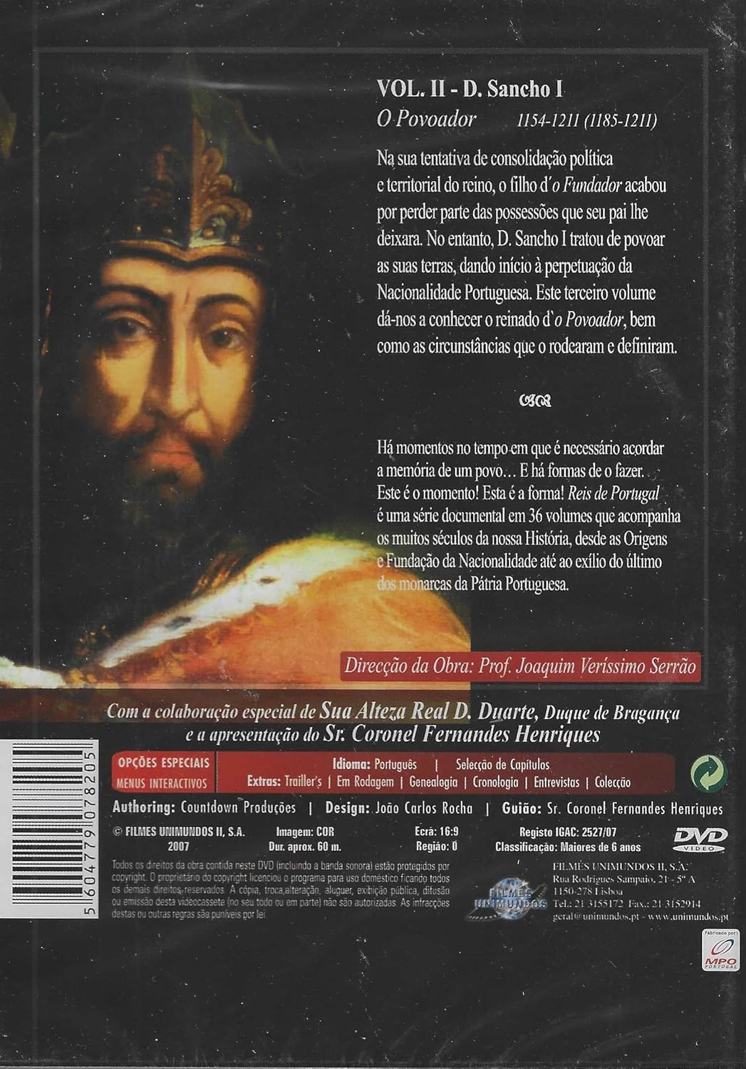 Descubra la fascinante historia de Portugal con este DVD documental sobre D. Sancho I, conocido como 'O Povoador' (El Poblador), que reinó entre 1154-1211. Este volumen II de la serie 'Reis de Portugal' explora en profundidad el reinado de este importante monarca portugués, quien, a pesar de perder algunas posesiones heredadas, fue fundamental en la consolidación política y territorial del reino. El documental, producido por Filmes Unimundos, ofrece una narrativa detallada sobre cómo D. Sancho I inició la perpetuación de la nacionalidad portuguesa a través de sus políticas de población. Con una duración aproximada de 60 minutos y en formato 16:9, este DVD incluye características especiales como menús interactivos, genealogía, cronología, entrevistas y una colección de trailers. Dirigido por el Prof. Joaquim Veríssimo Serrão, este documental educativo es parte de una serie de 36 volúmenes que documenta la rica historia de la monarquía portuguesa. Contenido en portugués con opciones de selección de capítulos para una experiencia de visualización personalizada.