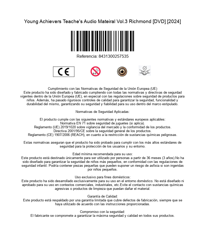 El Young Achievers Teacher's Audio Material Vol. 3 de Richmond es un completo paquete de recursos auditivos diseñado específicamente para educadores. Este material incluye 4 CDs de audio cuidadosamente estructurados: dos CDs para el libro del estudiante, un CD para el libro de actividades y un CD para el libro de recursos del profesor. Esta colección integral facilita la enseñanza efectiva del idioma, proporcionando materiales auditivos que complementan perfectamente el programa educativo. Los CDs contienen grabaciones profesionales que ayudan a desarrollar las habilidades de comprensión auditiva de los estudiantes mientras ofrecen a los profesores herramientas versátiles para enriquecer sus clases. Parte de la prestigiosa serie Young Achievers, este material audiovisual está diseñado para optimizar la experiencia de aprendizaje y garantizar resultados académicos efectivos.
