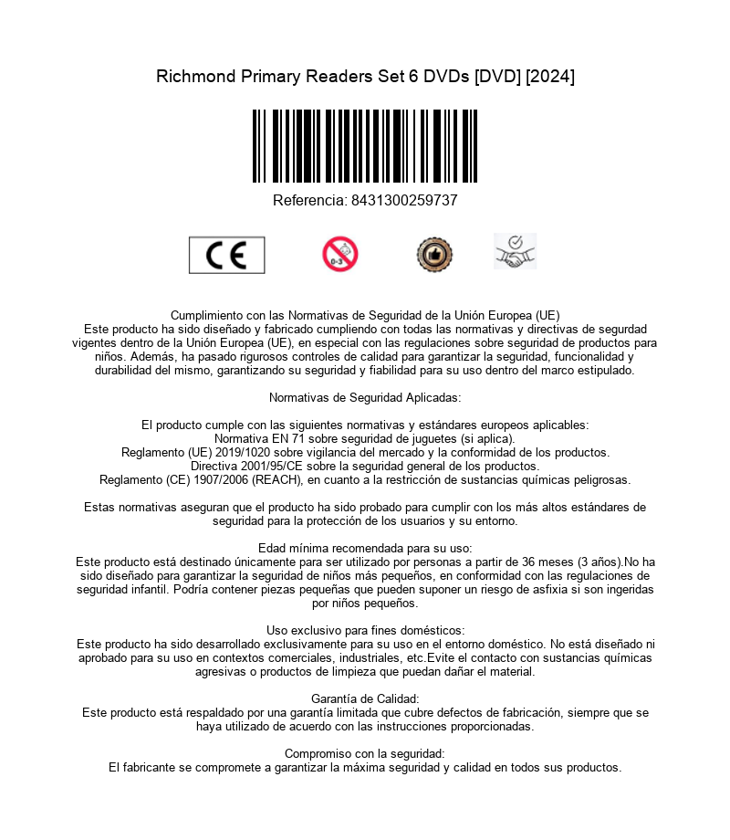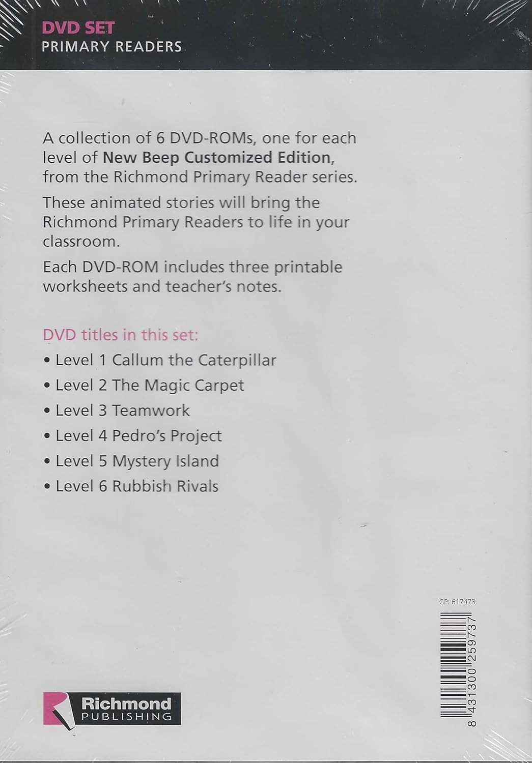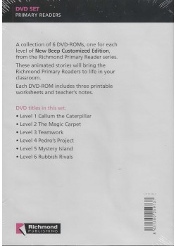 Descubre la colección completa de DVDs de Richmond Primary Readers, una serie educativa diseñada para enriquecer el aprendizaje en el aula. Este set incluye 6 DVDs con historias animadas cautivadoras, desde 'Callum the Caterpillar' hasta 'Rubbish Rivals', cada uno correspondiente a un nivel diferente de la serie New Beep Customized Edition. Cada DVD viene equipado con tres hojas de trabajo imprimibles y notas para el profesor, proporcionando recursos valiosos para la enseñanza. Las historias animadas transforman el contenido de los Richmond Primary Readers en experiencias visuales dinámicas que mantienen a los estudiantes comprometidos mientras aprenden. La colección incluye títulos fascinantes como 'The Magic Carpet', 'Teamwork', 'Pedro's Project', 'Mystery Island' y más, creando una progresión natural de aprendizaje a través de los seis niveles. Este set de DVDs es una herramienta esencial para hacer las clases más interactivas y entretenidas, complementando perfectamente el material impreso de Richmond Primary Readers.