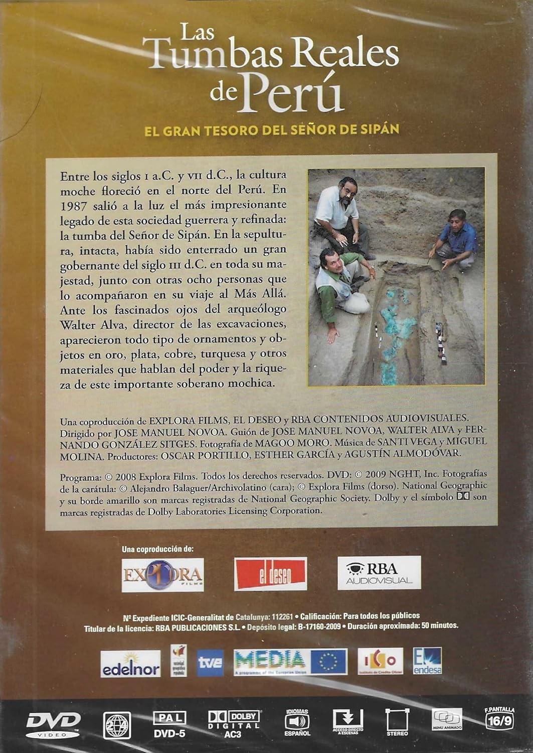 Descubra la fascinante historia de uno de los hallazgos arqueológicos más importantes de Perú en este documental de National Geographic. 'Las Tumbas Reales de Perú: El Gran Tesoro del Señor de Sipán' revela los secretos de la cultura moche que floreció entre los siglos I a.C. y VII d.C. Este DVD de 50 minutos documenta el extraordinario descubrimiento de 1987 de la tumba intacta del Señor de Sipán, un poderoso gobernante del siglo III d.C. La producción muestra los impresionantes ornamentos y objetos en oro, plata, cobre y turquesa encontrados en la sepultura, que demuestran la riqueza y el poder de esta antigua civilización. Dirigido por José Manuel Novoa y con la participación de destacados arqueólogos, este documental ofrece una ventana única a la majestuosidad de la cultura mochica. Formato PAL, audio en español, calidad Dolby Digital AC3 y pantalla 16:9.