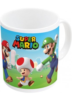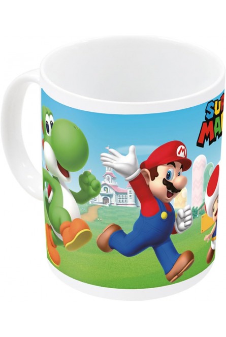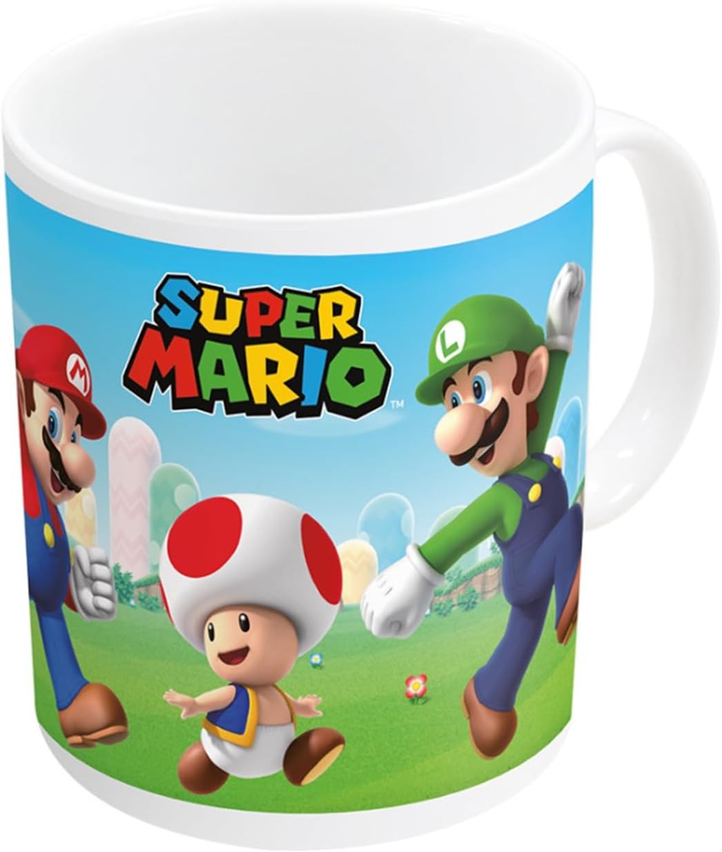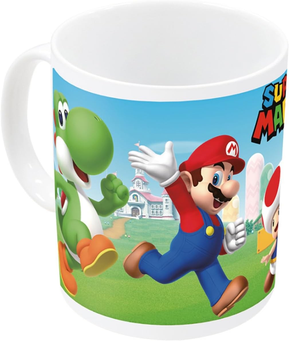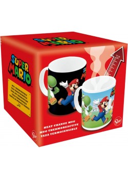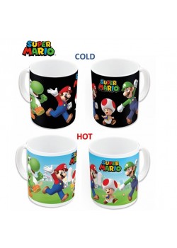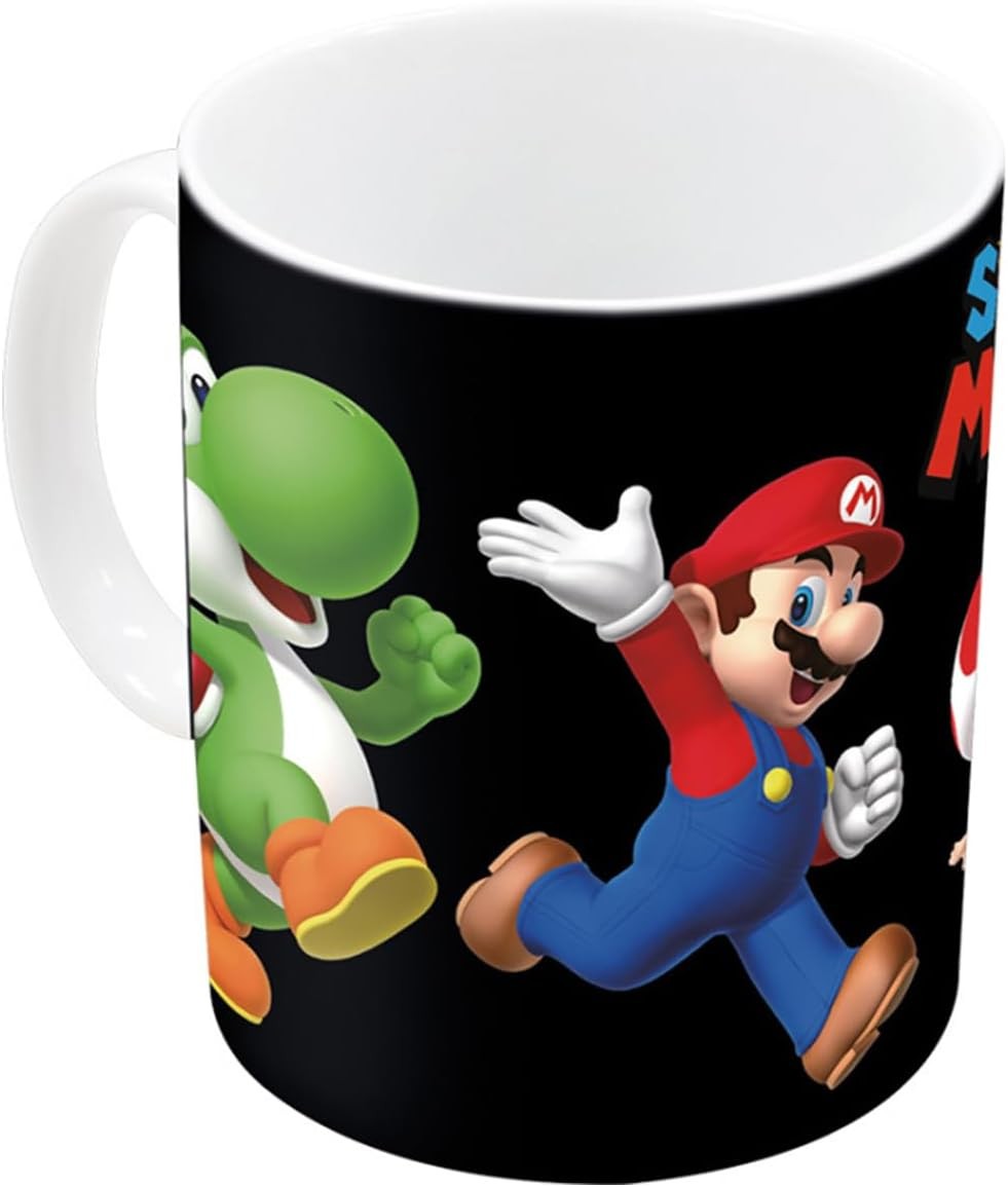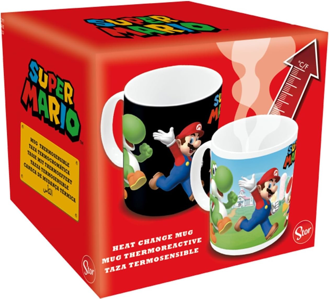 ¡El grupo de amigos más simpático y divertido del mundo de los videojuegos ya puede formar parte de tu día a día! Super Mario, Yoshi, Toad y Luigi se han sacado una foto de grupo y han decorado con ella la superficie de esta increíble taza sensitiva al calor, que, cuando eches bebida caliente en ella, ¡cambiará de color! El fondo oscuro de la taza se aclarará y enmarcará a los personajes que te dicen Hola mientras corren, en un entorno mucho más divertido y que expande su mundo. No es apta para lavavajillas ni microondas. Es una creación de la marca Stor y está hecha de cerámica y tiene una capacidad aproximada de unos 325 mls.